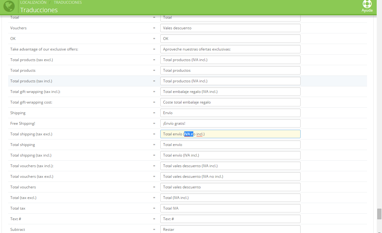 galindogadea Posted November 15, 2014 Share Posted November 15, 2014 Buenas tardes, Quiero quitar los dos "no" de "Total productos(IVA no incl)" y "Total (IVA no incl)" y he estado buscando en Localización --> Traducciones, he buscado mi tema, he seleccionado Front Office, lo he desplegado todo, lo he contrado y cambiado, le he dado a Guardar, he vaciado la cache... Y aún así me sigue mostrando el texto anterior .... ¿Saben si hay que hacer algo más? Adjunto captura Gracias! ¿En traducciones de los módulos has buscado? Link to comment Share on other sites More sharing options...