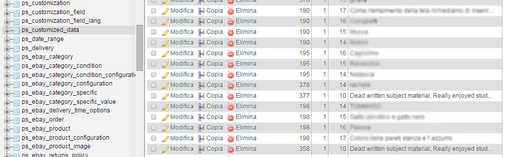 nicola82 Posted December 29, 2014 Author Share Posted December 29, 2014 ps_customization_field_lang looks clean but look w hat I've found in the PS_customized_data .. Link to comment Share on other sites More sharing options...