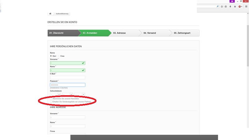 Wie schaffe ich es im Bild2 die Newsletteroption beim registrieren und die Sonderangebote von Partnern verschwinden.
