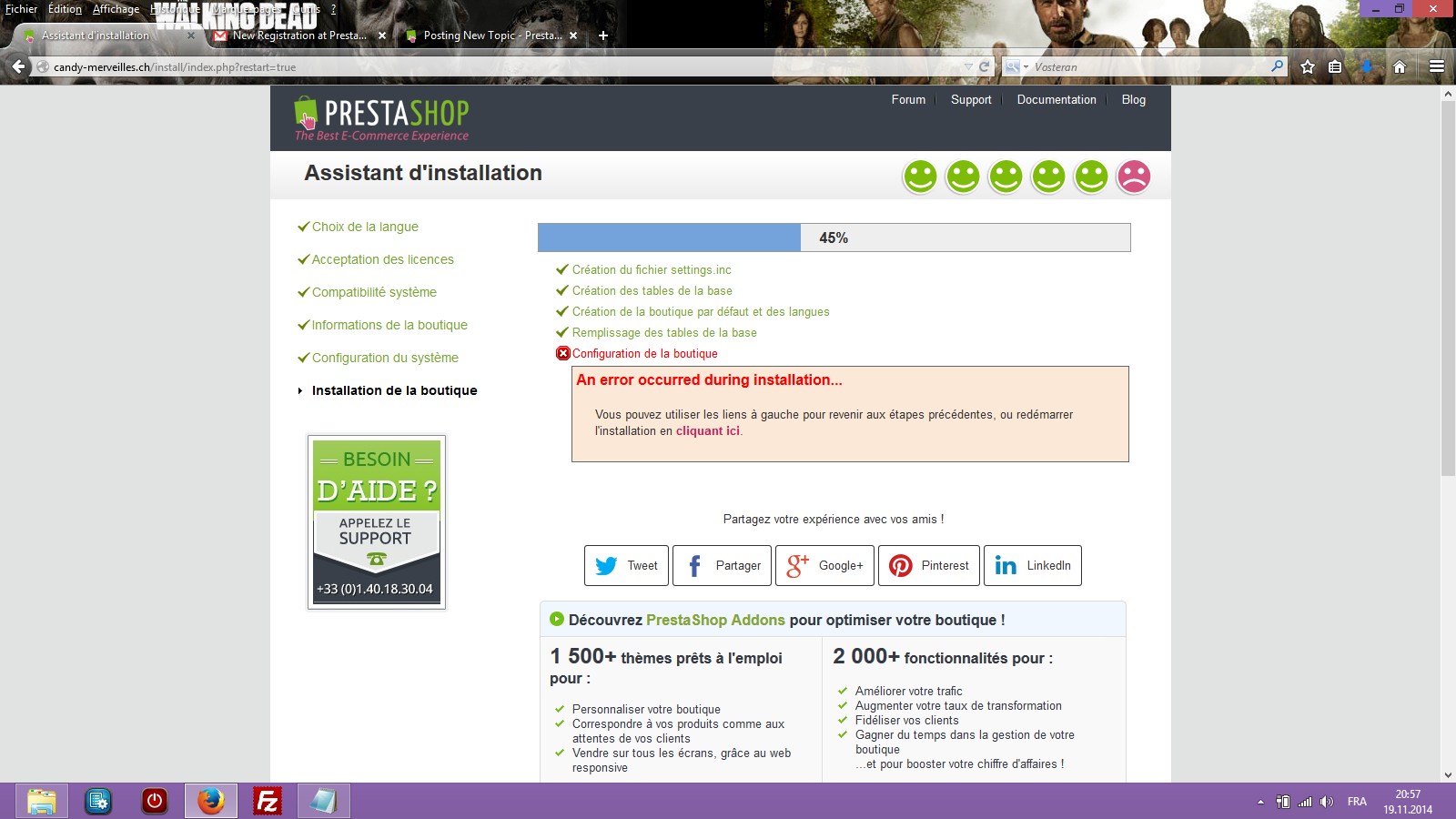 candy1801 Posted November 19, 2014 Share Posted November 19, 2014 Bonsoir Je suis entrain d'installer prestashop 1.6.0.9 et lors de l'installation à 45% tout s'arrête et j'ai ce message: Configuration de la boutique An error occurred during installation...Vous pouvez utiliser les liens à gauche pour revenir aux étapes précédentes, ou redémarrer l'installation en cliquant ici. J'ai cliqué pour redémarrer l'installation et chaque fois le même message. J'ai déjà tout supprimé les fichiers et réinstaller rien n'y fait. Je suis hébergée par easygiga je suis de suisse. Merci si quelqu'un arrive à m'aider, j'aimerais bien avoir réussi à mettre ma boutique en ligne assez rapidement. Belle soirée Link to comment Share on other sites More sharing options...