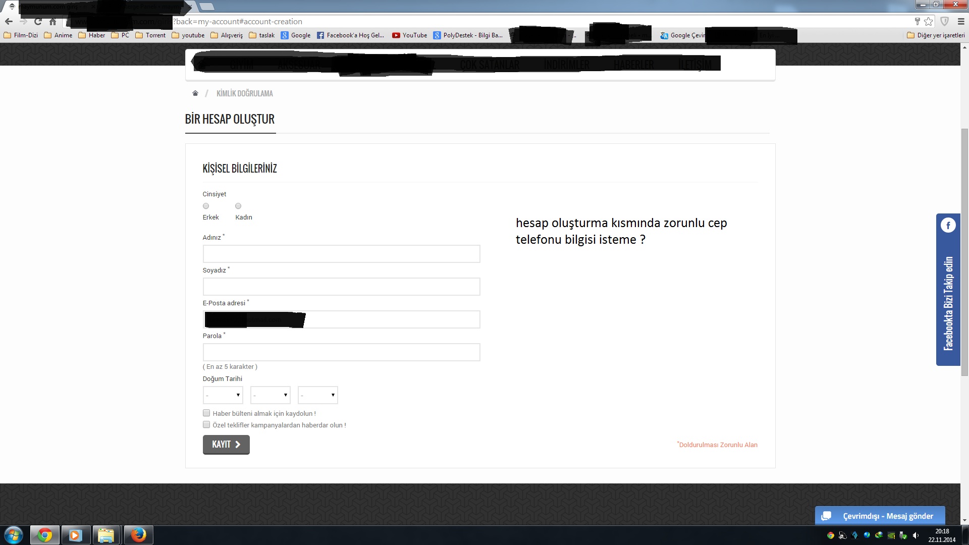 rakhaj Posted November 22, 2014 Share Posted November 22, 2014 Merhaba, Hesap oluşturulma kısmında adı-soyadı-email-doğumtarihi -parola var bunların altına her hangi bir yere zorunlu olarak cep telefonu bilgisi istenebilir mi ? Link to comment Share on other sites More sharing options...