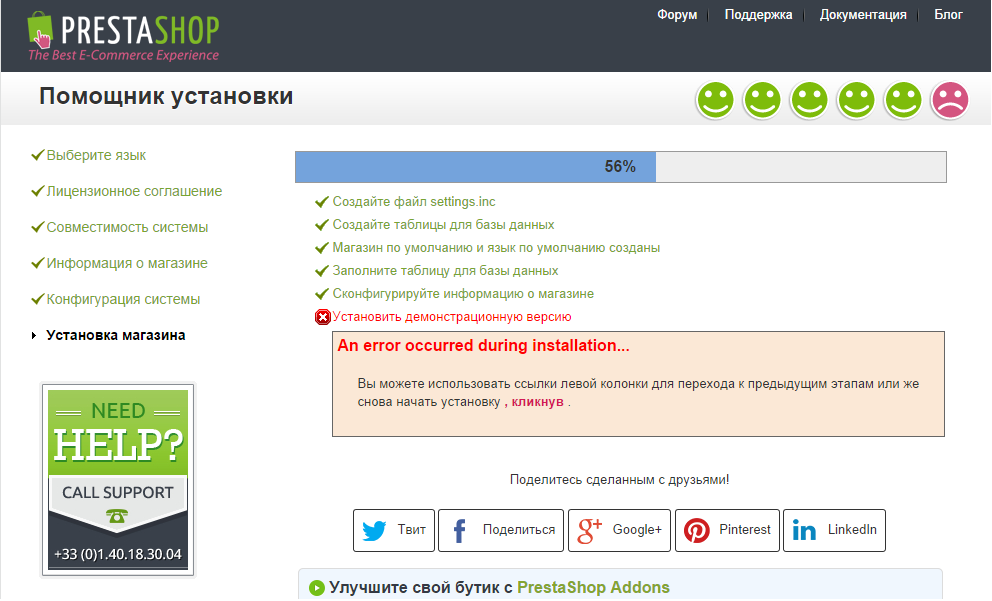 kluvi Posted November 23, 2014 Share Posted November 23, 2014 Всем привет. Не могу поставить на локальный комп PrestaShop. Использую Denwer. Все вроде делаю правильно, но в последнем шаге получаю вот такую ошибку. Когда искал причины, увидел такую разницу, что во всех видео-установках, есть пункты установка модулей и addons, а у меня сразу идет установка демонстрационной версии. Помогите пожалуйста, что делать? как исправить? Link to comment Share on other sites More sharing options...