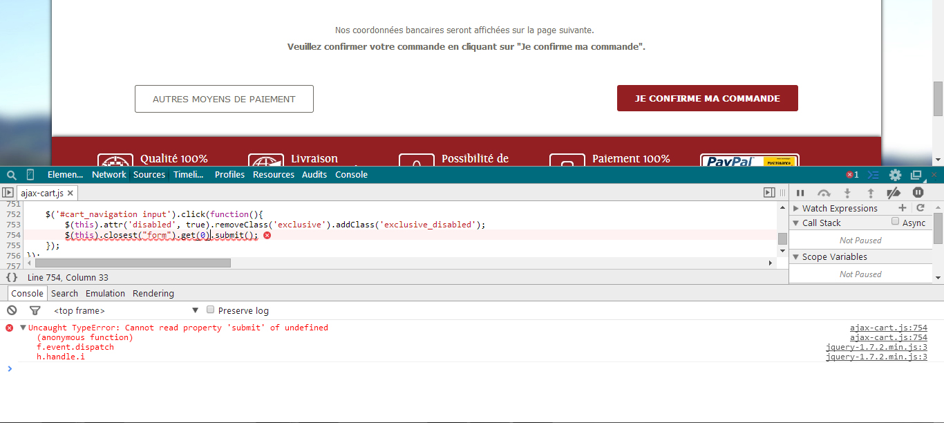 Niltz Posted November 23, 2014 Share Posted November 23, 2014 (edited) Hi everybody, I have the Bankwire module fully functional but once I try to place the order and get access to the bank account details nothing happens. I inspected the submit button with Chrome's element inspector and I do get an error after clicking the button but I don't know what's causing it nor if it's the cause of the problem. I've attached a printscreen of Chrome's console. The configuration is right, I even changed the country restriction to see if it would hide the bankwire module and everything went fine. So yeah, the configurations are alright. So that's it: I click the submit button, and nothing happens. By the way, I'm using Prestashop 1.5.6.0. Hope anyone can help me here! Edited November 24, 2014 by Niltz (see edit history) Link to comment Share on other sites More sharing options...