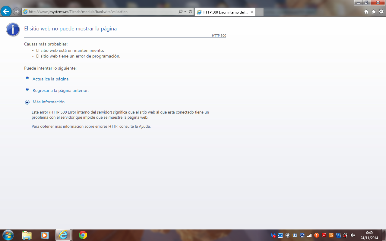 Zemog Posted November 23, 2014 Share Posted November 23, 2014 (edited) Hola otra vez, Estoy haciendo pruebas antes de echar a andar definitivamente la web, y me he encontrado con el problema, de que cuando voy a finalizar la compra por pago de transferencia bancaria, al pulsar sobre el botón confirmar pedido, me sale el error que adjunto con Internet explorer, o se queda la ventana en blanco sin contenido en google chrome, no mostrando los datos a donde se debe realizar la transferencia. ¿Qué puede ser? Edited November 25, 2014 by Zemog (see edit history) Link to comment Share on other sites More sharing options...