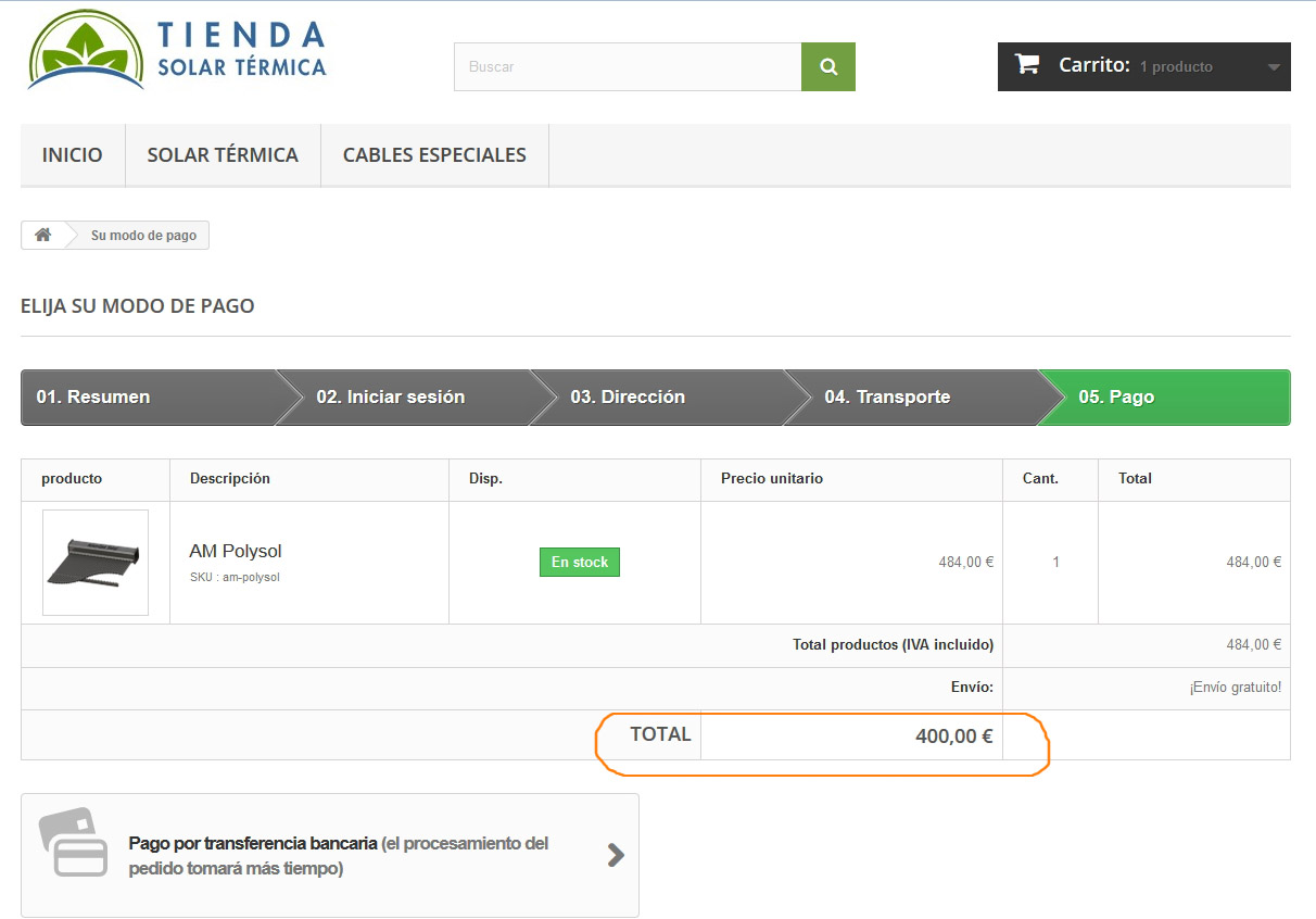 eduardovi Posted November 24, 2014 Share Posted November 24, 2014 Hola, Tengo instalado Prestashop 1.6.0.9 en el dominio www.tienda-solar-termica.com. En el ultimo paso del carrito de la compra (05. PAGO), aparece el total sin IVA en grande y negrita al final del todo. Eso es un poco confuso ya que, por lo general, debería de aparecer primero el precio sin IVA, la suma de los totales sin IVA y luego meter el IVA. Lo que quiero decir es que unas lineas más arriba pone total productos IVA incluido y luego debajo aparece más grande y en negrita la palabra TOTAL y esa cantidad logicamente es inferior que la que aparece con IVA más arriba. ¿Tiene arreglo sin tocar la programación del carrito? me imagino que podría editar el código y quitar la linea que contiene el TOTAL último sin IVA pero no sé si eso podría afectar en algo al funcionamiento de la aplicación. Adjunto les envio una imagen donde pueden ver lo que les comento. Un cordial saludo, Link to comment Share on other sites More sharing options...