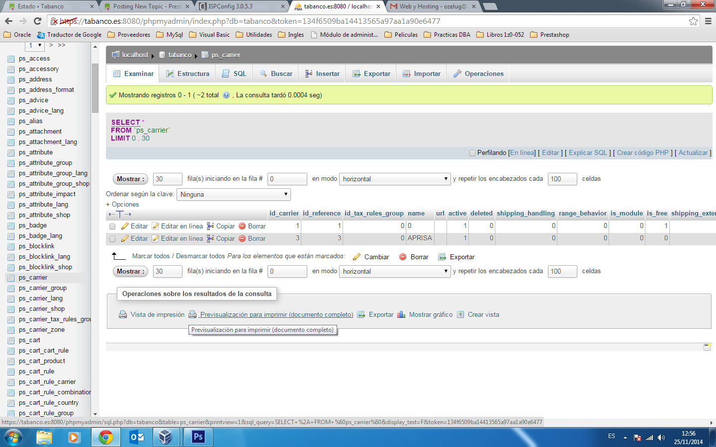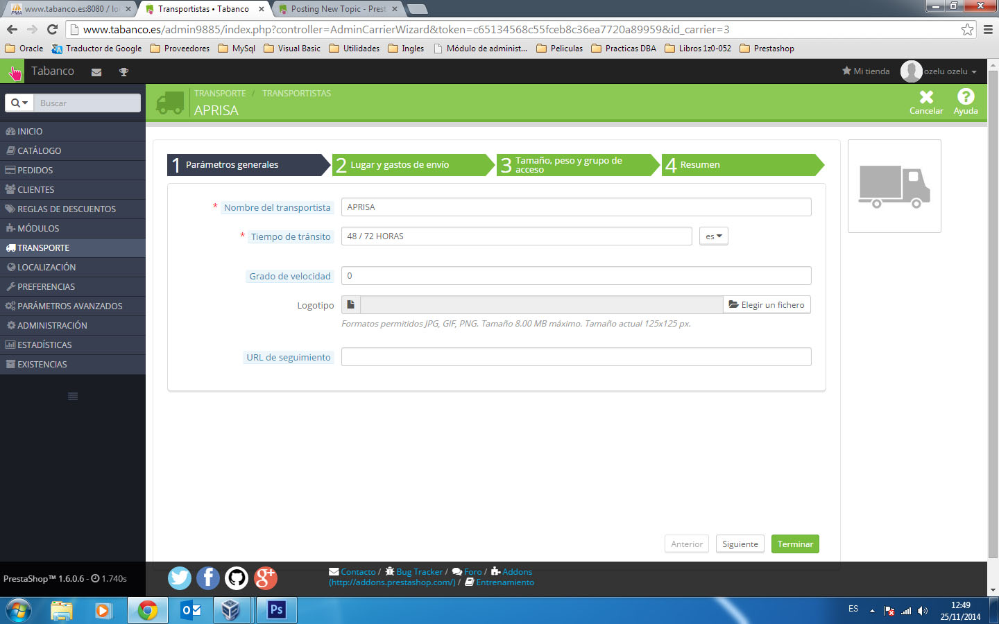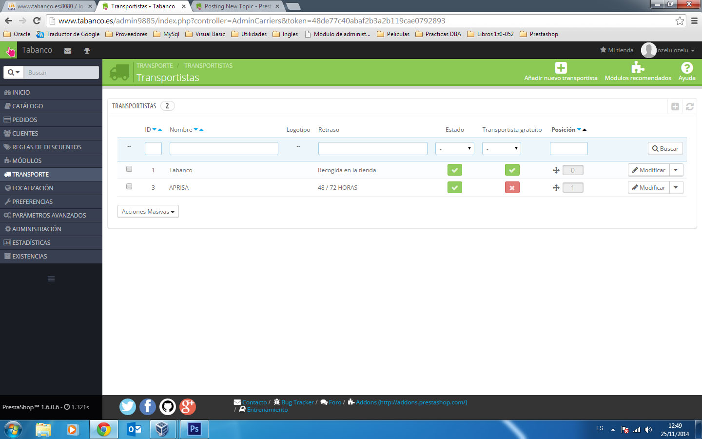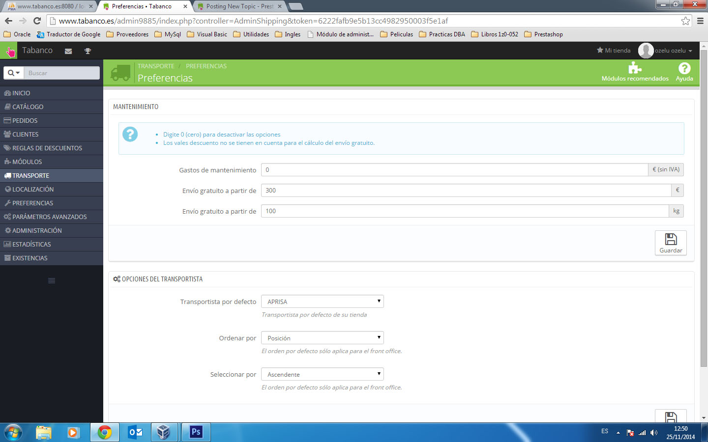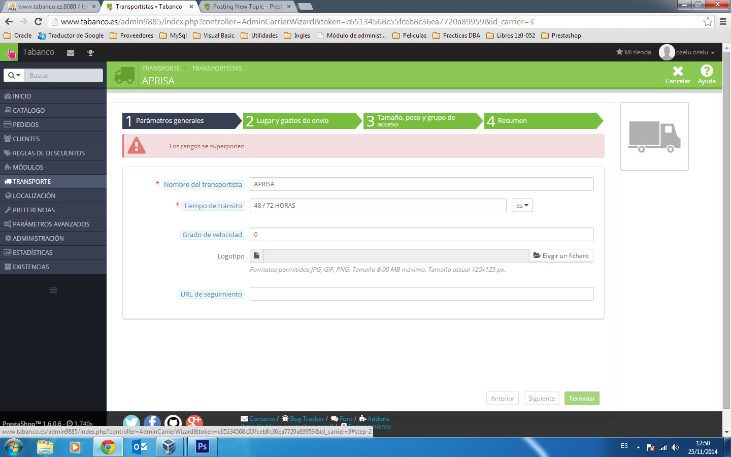 ozelu Posted November 25, 2014 Share Posted November 25, 2014 Hola a todos, ya se que se ha hablado bastante de esto por el foro, pero creerme cuando digo que llevo 2 días leyendo de todo y me ha sido imposible solucionar el problema. Tengo instalada una tienda en prestashop 1.6, tenia configurado un transportista y todo iba perfecto. El cliente me solicito que quería ampliar la zona de entrega, dependiendo del lugar y el peso del paquete el porte tendría un costo. Bueno pues cree las zonas, configure el país y estados de las zonas y cree los rangos en el transportista para cada zona. Desde entonces solo me aparece envío gratuito, ya he revisado que no este envío gratuito activado, que el transportista por defecto sea el correcto, he vaciado las tablas ps_carrier y rellenado manualmente, etc... Siempre me marca tanto registrado como sin registrarme en la web envío gratuito y cuando llego al paso de confirmación me indica que no hay transportista disponible. Tambien ha empezado a aparecerme un error que me indica que los rangos se interponen al intentar ver el transportista. Adjunto imagenes. Espero alguien pueda ayudarme, gracias de antemano. Link to comment Share on other sites More sharing options...