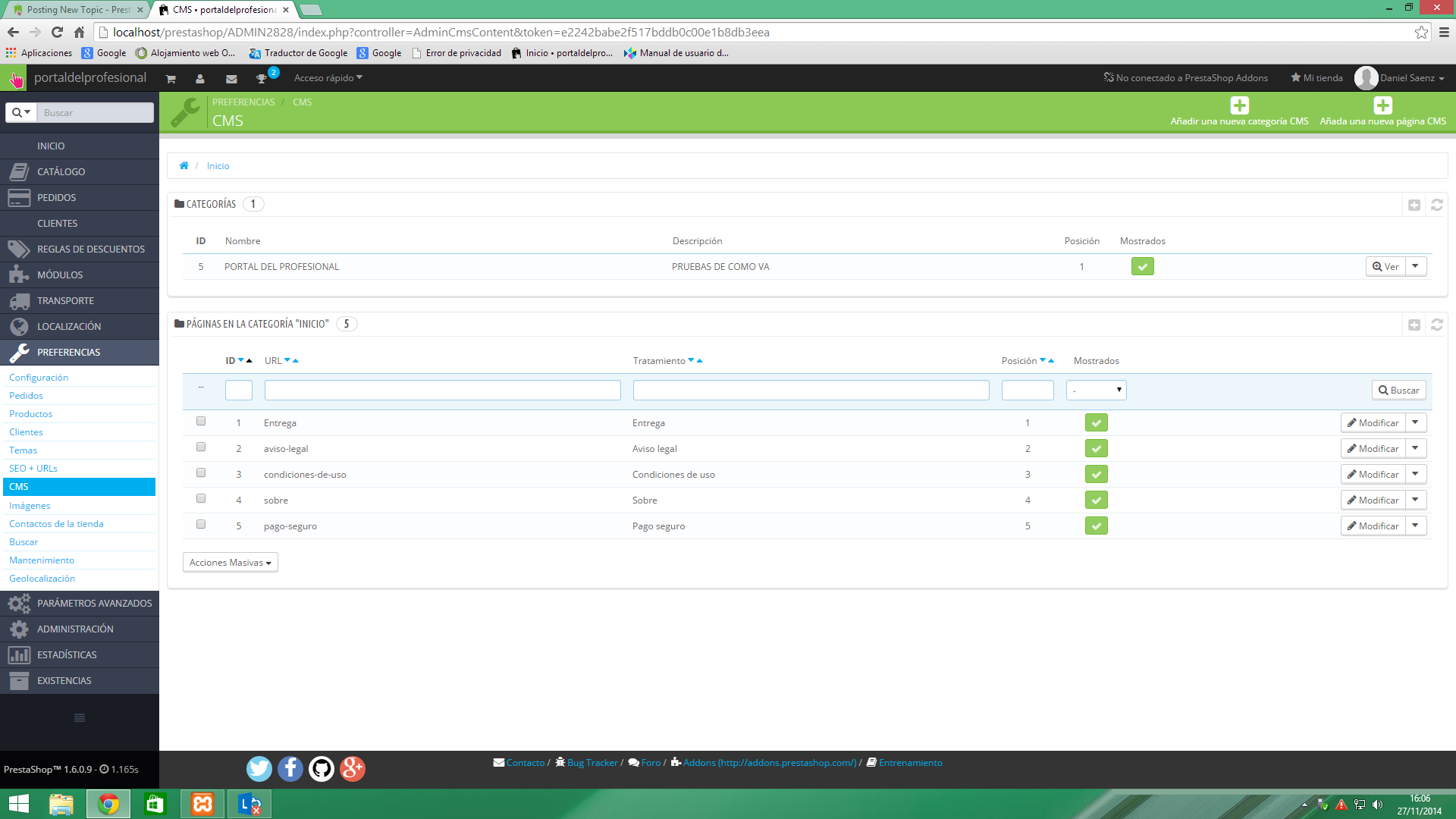 Jessy Posted November 28, 2014 Share Posted November 28, 2014 Si no me equivoco, los CMS no son para crear categorías en la barra horizontal superior. Los CMS salen en el footer. No sé por qué te da error pero si quieres colocarla en la barra de menú horizontal no es ahí, es en el "categorías" dentro del menú "Catálogo" y luego debes anclar esa nueva categoría a Inicio. Link to comment Share on other sites More sharing options...