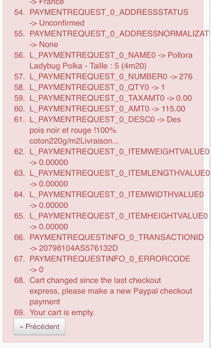 Eolia Posted December 2, 2014 Share Posted December 2, 2014 L'erreur affichée ci-dessus est claire: L'id du panier a changé, Paypal n'arrive pas à faire le rapprochement car il trouve un panier vide. Cela ressemble fortement à un problème de cookies. Donc comme dit plus haut: videz les caches et cookies et forcez la régénration des tpl modifiés. Attention si vous avez rétrogradé votre version Paypal, vous serez de nouveau bloquée à partir de demain... Link to comment Share on other sites More sharing options...
