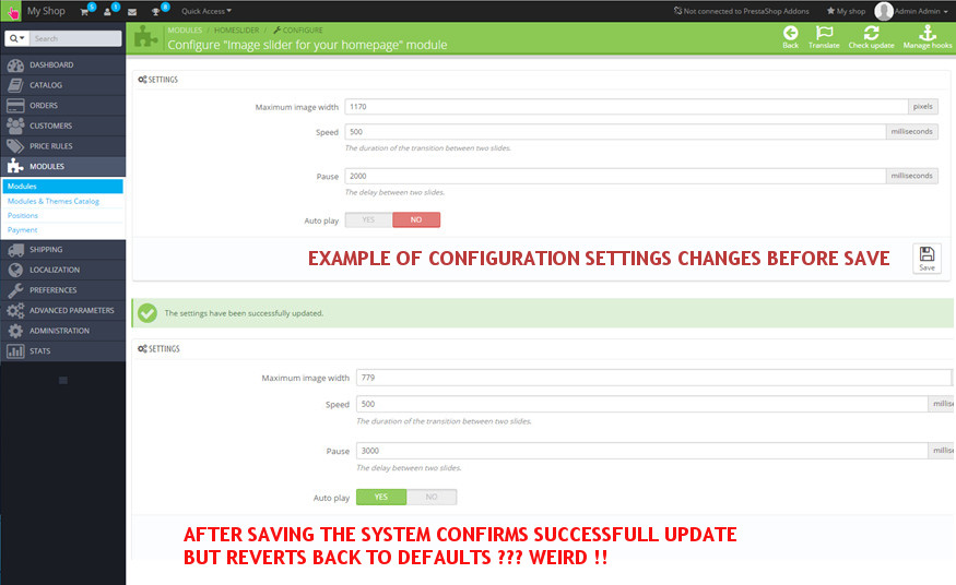 MGVDP Posted November 30, 2014 Share Posted November 30, 2014 I'm sure there's a simple explanation but I have been tearing my hair out for the last 2 days. All I want to do is to update the Maximum width in the image slider for home page slider module. I need the maximum width of 1170px in that module. When I save it the system confirms that this has been successfully updated but it reverts back to original 779px straight away. Because of that I tried to update other settings (including the YES/NO autoplay setting) and the same happens - no change. I have installed this several times in different locations and 2 versions. Same problem. I have no idea why and it's most probably basic. Maybe somebody can help. I have tried to update css and even js manually but to no avail. I have attached a jpg of what happens in a constructed image. Image slider for your homepage" module Image slider for your homepage Link to comment Share on other sites More sharing options...