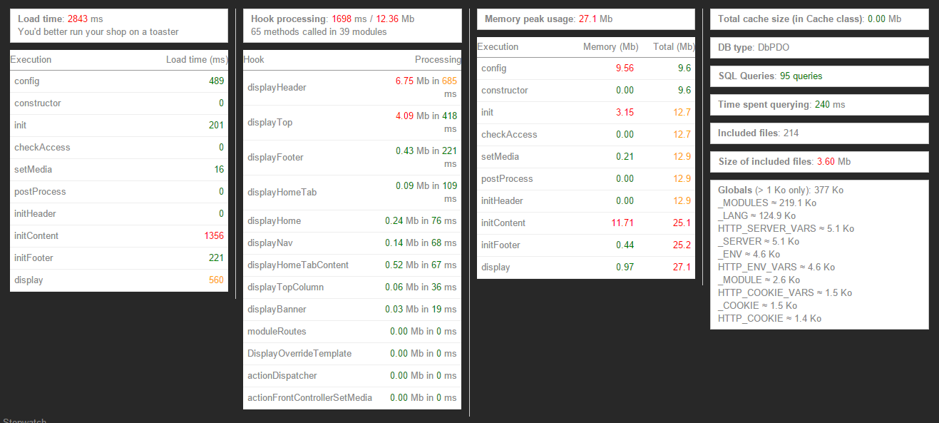monkeythreads Posted December 11, 2014 Author Share Posted December 11, 2014 (edited) You should enable profiling to see where your site is slow. what is your PS version? I checked shop, you have java bottom, great thing. if 1609 apply this fix. http://www.prestashop.com/forums/topic/349796-performance-hot-fix-please-apply-solved-1609-class-indexphp-has-disappeared/ You should enable profiling to see where your site is slow. I have enables Debug mode, and read about it but don't quite understand exactly what everything means, any help as to a good strategy to speed things up after looking at debug? what is your PS version? I checked shop, you have java bottom, great thing. if 1609 apply this fix. I'm running 1.609 and yes i uploaded the new Auto-Uploadfile for the fix but it didn't really help much. Edited December 11, 2014 by monkeythreads (see edit history) Link to comment Share on other sites More sharing options...