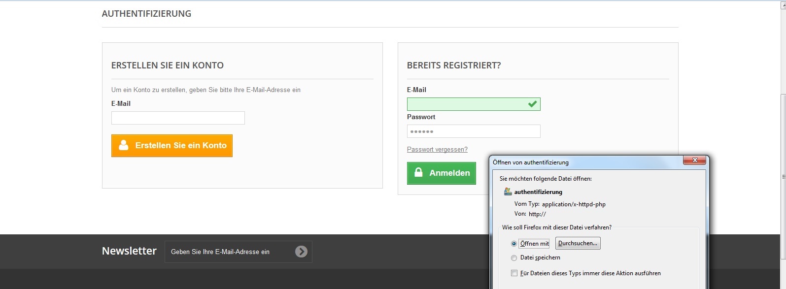 Beim Login mit einem zuvor erstellen Benutzer (vor Anlage der Artikel) erhalte ich statt dem Login eine Meldung zum "Herunterladen" einer Datei (siehe Screenshot 1).