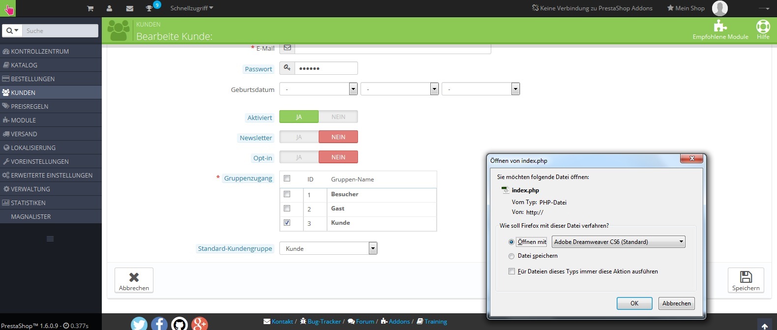Auch wenn ich im Backoffice beispielsweise das Passwort des Kunden ändern möchte, tut er dies nicht, sondern möchte auch eine Datei herunterladen (siehe Screenshot 2).