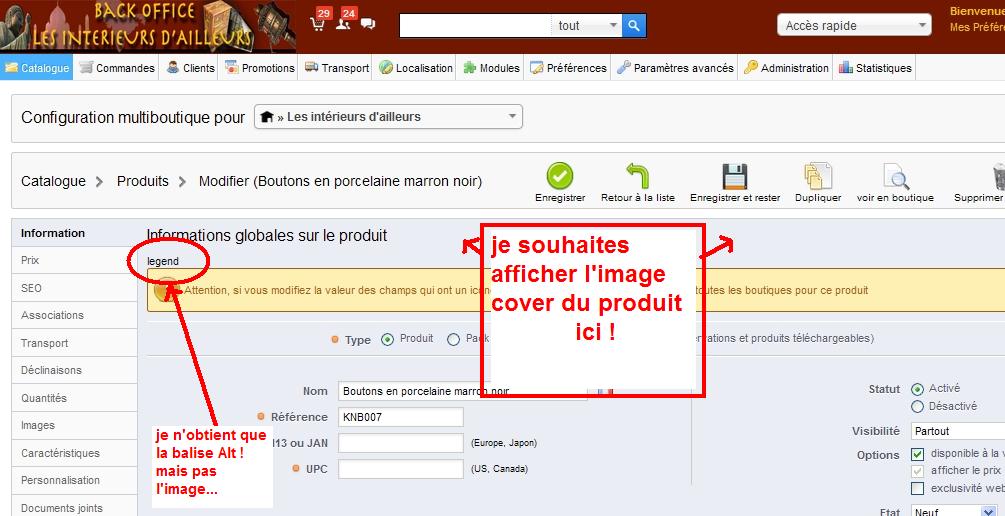 l'indien Posted December 6, 2014 Share Posted December 6, 2014 (edited) Bonjour à tous, je suis en PrestaShop™ 1.5.6.2 et je souhaites ajouter l'image (cover) du produit quant je suis sur la page information du produit. Je pourrais donc mieux décrire le produit quant je serais en train de saisir sa description et autre... donc la question est la suivante : - ou dois je ajouter du code et dans quel fichier php (controller ou autre) ? est ce /controllers/admin/AdminProductsController.php ? - afin que celui ci me passe bien la bonne variable a afficher dans le template ? (je pense qu'il s'agit du template : /themes/default/template/controllers/products/information.tpl) je joint un capture d'écran ! Edited December 7, 2014 by l'indien (see edit history) Link to comment Share on other sites More sharing options...