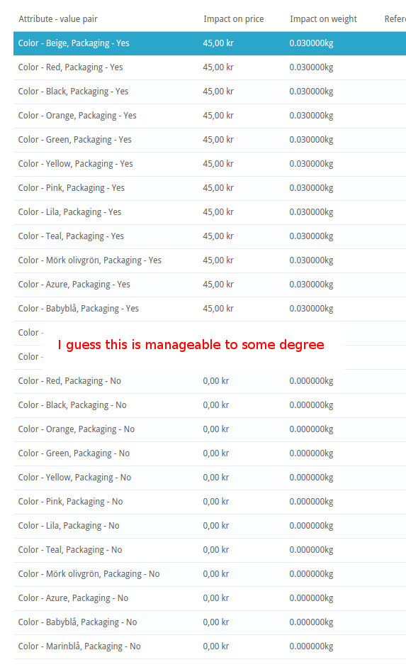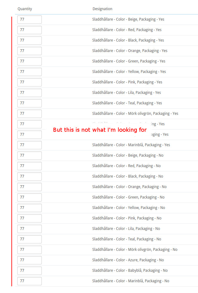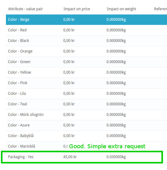 csamu Posted December 7, 2014 Share Posted December 7, 2014 (edited) Hello everyone. I have some questions and I will try to be brief. I have a product on which I want to enable "optional packaging" as radio buttons. I thought I could use attributes ... Im going to present my issues as images: This is what the Front Office looks like, and what I want: This is what I thought the structure would look like: This is what I wanted; clean and simple: This was the real, uncomfortable, result. After all, PS can only handle attributes with permutations: This was the real problem and deal breaker: So. What I really am looking for is a way to decouple/separate an attribute from the permutations (combinations) and use it as an independent option. I have (already) noticed Presto-Changeo Attribute Wizard / Single Stock Attributes, but i thought this feature would be included in the main package. Its just 2 simple radio buttons. I also don't think you can place Attribute Wizards radio buttons in the product info box (under the colors). It really seems a little hacky to get all of this working. I have read that other people have had this problem too and ended up actually moving to another platform. Im not sure, is this a deal breaker? Comments? After all, this platform is free and open source Thank you PrestaShop company. Edited December 7, 2014 by csamu (see edit history) Link to comment Share on other sites More sharing options...
