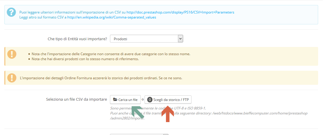 brunomig Posted December 9, 2014 Share Posted December 9, 2014 Buonasera, ho installato l'ultima versione di Presta shop (1.6). Riscontro un problema nella gestione dell'import di file csv. In pratica i pulsanti "carica un file" e " Scegli da storico/FTP" non permettono le azioni che dovrebbero. Noto anche che cambiando le Entità che vogliamo importare (catalogo, prodotti ecc) non viene visualizzata la finestra di "cambi disponibili" . In pratica tutto rimane fermo... Allego foto. Qualcuno riesce ad illuminarmi. Grazie a tutti. Link to comment Share on other sites More sharing options...