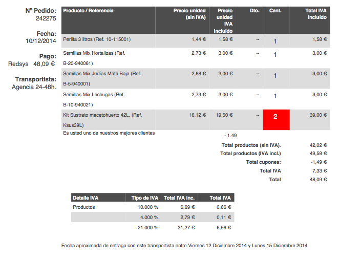 __fito__ Posted December 10, 2014 Share Posted December 10, 2014 (edited) Hola amig@s y gracias anticipadas por vuestra ayuda, En nuestra tienda preparamos los pedidos mirando directamente la factura que enviamos al cliente, ahorramos papel imprimiendo únicamente este documento en tamaño A5 reciclado. Nos pasa frecuentemente, que debido a la disposición de la factura, nos equivocamos con las cantidades. Casi siempre es una unidad de cada, y a veces cuando ponen 2 o más, no nos damos cuenta. Me gustaría saber cómo puedo resaltar el campo de cantidad, cuando el valor el >1 Por ejemplo, que el fondo de la celda se ponga en rojo o algo así para evitar confusiones. He editado el invoice.tpl para ampliar algunos tamaños de letra, pero no sé cómo poner el código para añadir esta función. Muchas gracias por vuestra ayuda, Edited December 11, 2014 by __fito__ (see edit history) Link to comment Share on other sites More sharing options...