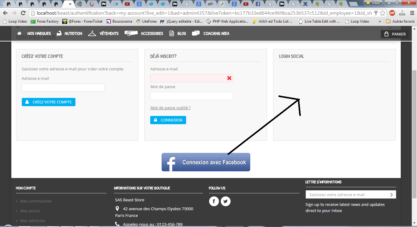 ghost4life Posted December 22, 2014 Share Posted December 22, 2014 Hi, I use a module called facebookcanadv, for social Login. I want to move it inside of my authentification page, the trouble is that It does not want to go, where I wan't. I guess I'm doing something wrong, but I have no Idea What. I've changed the hook where it was, for the hook DisplayCustommerAccountFormTop but it does not move. It is just displayed in the authentification page as expected but in the wrong place. Below is the image of my webste: I want that module to go where the arrow goes. I apologies for my poor english. Anykind of help will be much appreciated. Kind Regards Link to comment Share on other sites More sharing options...
