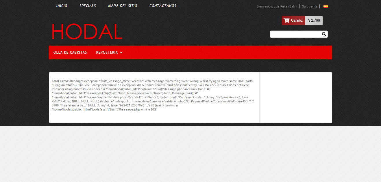 Fatal error: Uncaught exception 'Swift_Message_MimeException' with message 'Something went wrong whilst trying to move some MIME parts during an attach(). The MIME component threw an exception:<br />Cannot remove child part identified by '5498843653907' as it does not exist. Consider using hasChild() to check.' in /home/hodal/public_html/tools/swift/Swift/Message.php:542 Stack trace: #0 /home/hodal/public_html/classes/Mail.php(196): Swift_Message->attach(Object(Swift_Message_Part)) #1 /home/hodal/public_html/classes/PaymentModule.php(522): MailCore::Send(3, 'order_conf', 'Confirmacion de...', Array, '[email protected]', 'Luis Pe\xC3\xB1a', NULL, NULL, NULL) #2 /home/hodal/public_html/modules/bankwire/validation.php(62): PaymentModuleCore->validateOrder(456, '10', 5700, 'Trasferencia ba...', NULL, Array, 4, false, 'b72421523079a0f...') #3 {main} thrown in/home/hodal/public_html/tools/swift/Swift/Message.php on line 542