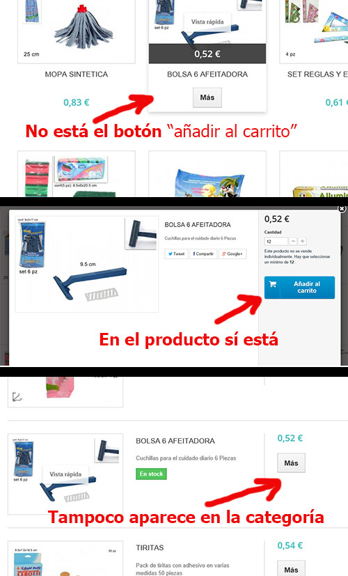 bobesponja Posted December 23, 2014 Share Posted December 23, 2014 (edited) Buenas! Tengo la versión 1.6.0.9 con el tema default. ¿Alguno sabe el motivo por el que sólo me aparece el botón de "añadir al carrito" en la página de cada producto pero no aparece en los productos de la página principal o cuando entro en las categorías? ¿Hay que activar alguna opción de la tienda? Adjunto imagen por si es de ayuda. Muchas gracias. Edited December 29, 2014 by bobesponja (see edit history) Link to comment Share on other sites More sharing options...