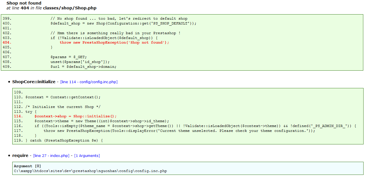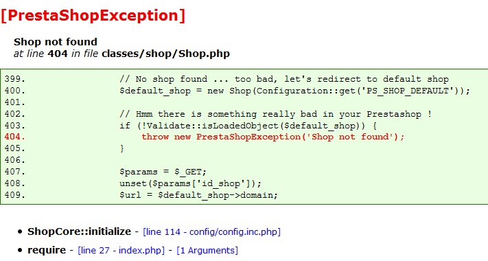 [email protected] Posted December 24, 2014 Share Posted December 24, 2014 (edited) [PrestaShopException] Shop not foundat line 400 in file classes/shop/Shop.php 394. // No shop found ... too bad, let's redirect to default shop395. $default_shop = new Shop(Configuration::get('PS_SHOP_DEFAULT'));396.397. // Hmm there is something really bad in your Prestashop !398. if (!Validate::isLoadedObject($default_shop))399. throw new PrestaShopException('Shop not found');400.401. $params = $_GET;402. unset($params['id_shop']);403. $url = $default_shop->domain;404. if (!Configuration::get('PS_REWRITING_SETTINGS')) ShopCore::initialize - [line 97 - config/config.inc.php] require - [line 34 - admin/index.php] - [1 Arguments] ShopCore::initialize - [line 97 - config/config.inc.php]91. $context = Context::getContext();92.93. /* Initialize the current Shop */94. try95. {96. $context->shop = Shop::initialize();97. $context->theme = new Theme((int)$context->shop->id_theme);98. if ((Tools::isEmpty($theme_name = $context->shop->getTheme()) || !Validate::isLoadedObject($context->theme)) && !defined('_PS_ADMIN_DIR_'))99. throw new PrestaShopException(Tools::displayError('Current theme unselected. Please check your theme configuration.'));100. }101. catch (PrestaShopException $e) require - [line 34 - admin/index.php] - [1 Arguments]28. define('_PS_ADMIN_DIR_', getcwd());29.30. if (!defined('PS_ADMIN_DIR'))31. define('PS_ADMIN_DIR', _PS_ADMIN_DIR_);32.33. require(_PS_ADMIN_DIR_.'/../config/config.inc.php');34. require(_PS_ADMIN_DIR_.'/functions.php');35.36. //small test to clear cache after upgrade37. if (Configuration::get('PS_UPGRADE_CLEAR_CACHE'))38. { After Upgrade 1.4.11 to 1.6.0.9 .... It was this error. Pls help me... Edited December 24, 2014 by [email protected] (see edit history) Link to comment Share on other sites More sharing options...