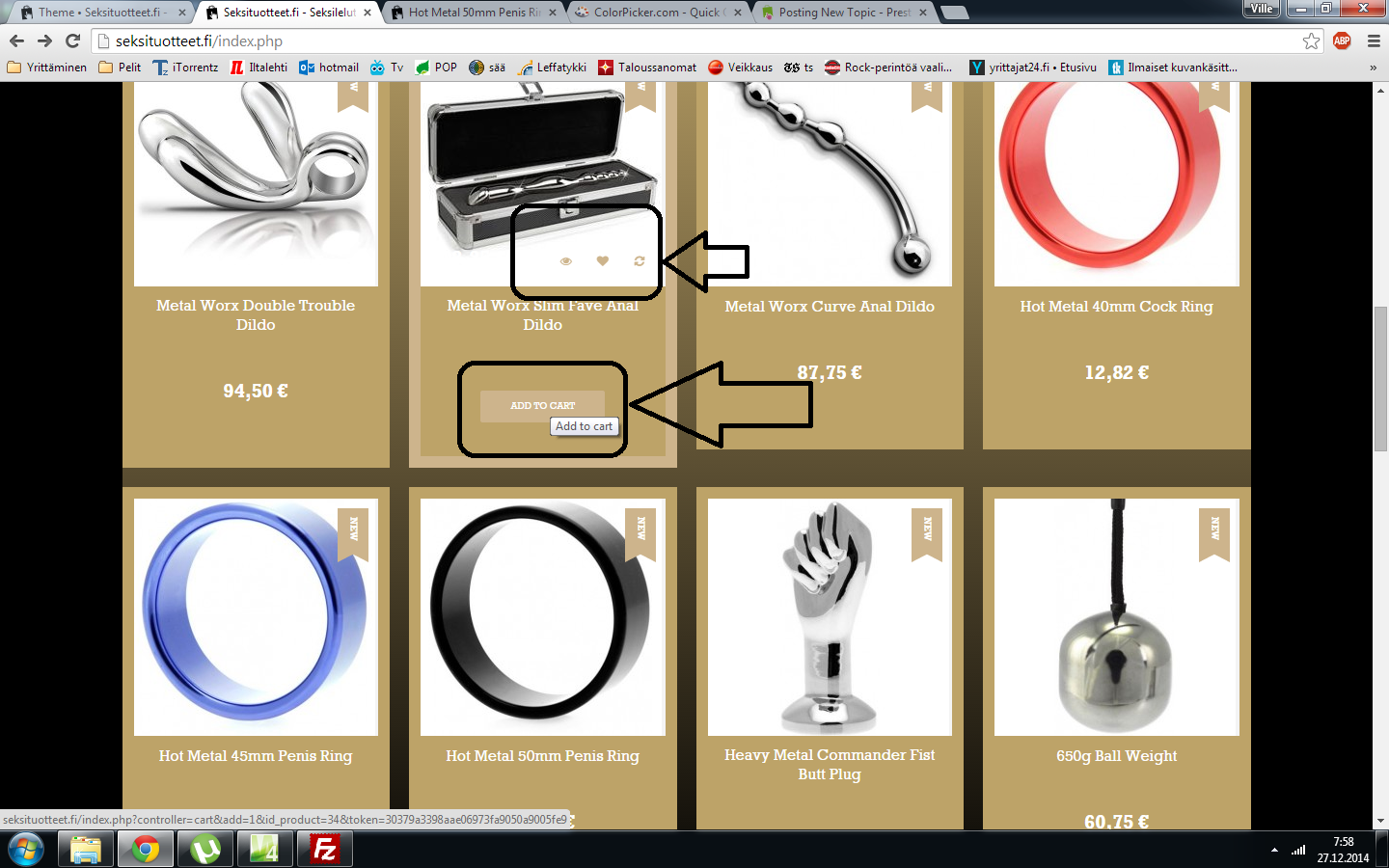 cille5 Posted December 27, 2014 Share Posted December 27, 2014 (edited) I have made some changes to global.css, but I really can't find... -Where I can change hoverin color of buttons? seksituotteet.fi See Image attachment ________________________________ http://seksituotteet.fi/index.php?id_product=38&controller=product&id_lang=1 -On this page background is black and also is some of the text also. There is description text under the text "Condition New" Paint the are under the text "Condition New" with mouse.. Edited December 27, 2014 by cille5 (see edit history) Link to comment Share on other sites More sharing options...