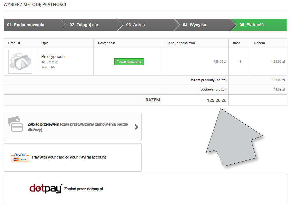 Testuję sklep na aktualnej wersji. Zastanawiam się, skąd bierze się wartość zamówienia w piątym kroku zamówienia - "Płatność". Przykładowo towar kosztuje 139zł brutto - (prawidłowo wyświetlane), razem produkty - 139zł brutto (wszystko się zgadza), dostawa 14,99zł brutto (prawidłowo wyświetlana). Ale jest też wiersz RAZEM wyświetlający wartość... 125,20zł... Już po przejściu krok dalej w podsumowaniu jest już prawidłowo zsumowana kwota za towar z dostawą.