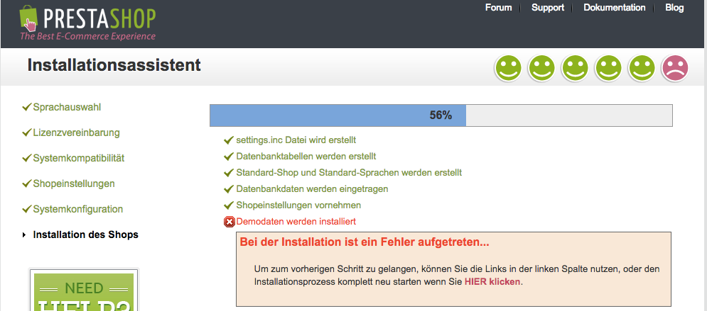 jonesir Posted December 29, 2014 Share Posted December 29, 2014 (edited) Hallo, habe mehrmals versucht, prestashop auf meinem Server zu installieren, alles läuft reibungslos bis 56% und kommt nie weiter wegen eines Fehlers bei der "Demodaten werden installiert" Phase... Was kann der Grund sein bzw. wie lässt sich dieses Problem beheben? Vielen Dank im voraus Edited December 29, 2014 by jonesir (see edit history) Link to comment Share on other sites More sharing options...