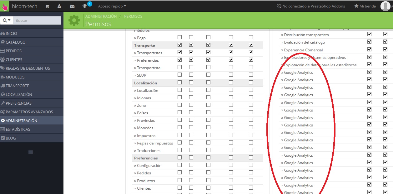 albahicom Posted January 8, 2015 Author Share Posted January 8, 2015 Lo he borrado desde el FTP y en la base de datos borré la tabla "ps_ganalytics". ¿Es suficiente?....quiero pensar que no porque: Si accedo en el back-office al apartado de preferencias/permisos, se me listan un montón de módulos google analytics instalados, que deben ser consecuencia de los intentos que hice cuando quería configurarlo. (dejo pantallazo) ¿Qué debo tocar? Link to comment Share on other sites More sharing options...