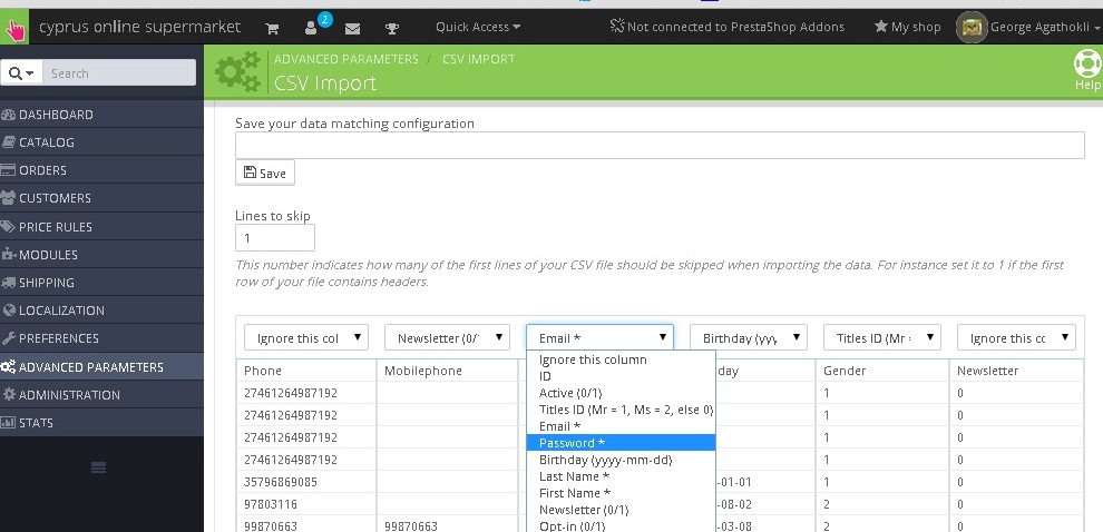 pahnas Posted January 10, 2015 Share Posted January 10, 2015 Hello everyone and a happy new year 2015, i used to use version 1.4.6.2 of prestashop and i create a NEW e-shop 1.6.9 Now i export all me excising clients but unfortunately i cannot import the to my new eshop 1.6.0.9 since there is no address field, no postal code not even tel field. How is possible to insert the old customers if there is no option even for a phone??? please see below the attachment Link to comment Share on other sites More sharing options...