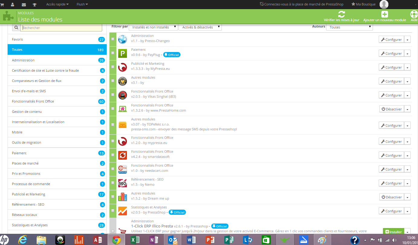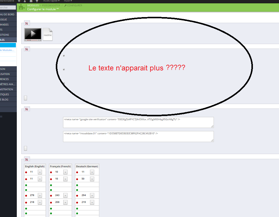 andre marechalerie Posted January 10, 2015 Share Posted January 10, 2015 (edited) Bonjour à la communauté, Voila depuis la mise à jour de presta 1.6.0.9 vers 1.6.0.11,j'ai plusieurs problèmes qui sont apparus : - problème d'affichage de modules dans le back office (Photo 1) - certains des modules n'affiche pas leur contenu (photo 2) J'ai également essayé de faire un backup, mais c'est impossible message d'erreur Si quelqu'un veut bien vouloir me conseiller sur les corrections a apporter je suis preneur, merci d'avance. Mon site Internet : www.andre-marechalerie.com Edited January 11, 2015 by andre marechalerie (see edit history) Link to comment Share on other sites More sharing options...