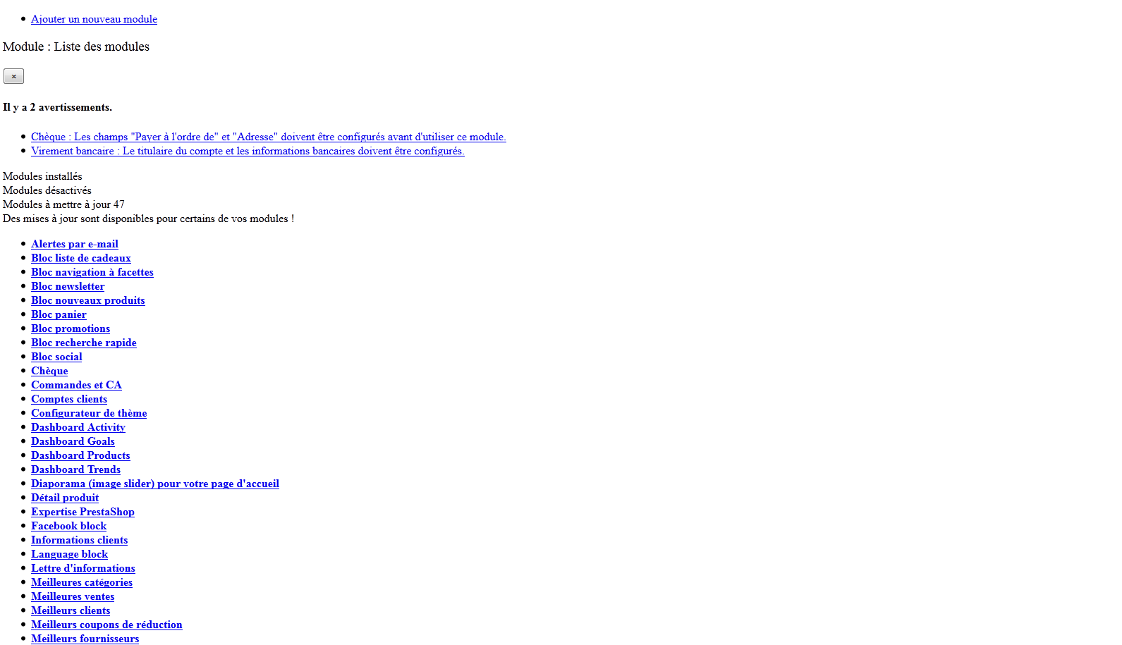 lepoisson Posted February 19, 2015 Share Posted February 19, 2015 (edited) Bonjour, Moi aussi j 'ai un problème avec l'onglet "Modules" sur prestashop. Je suis en 1.4.9 et depuis plusieurs mois, l'onglet ne s'ouvre pas, au départ le problème disparassait mais maintenant c'est récurrent. Je n'ai pas de message d'erreur, mais au bout d'une minute j'ai une page de back office classique avec tous les onglets en haut une page blanche. Merci de m'aider, c'est vraiment urgent et problématique. Edited February 19, 2015 by lepoisson (see edit history) Link to comment Share on other sites More sharing options...