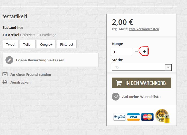 kalua Posted January 12, 2015 Share Posted January 12, 2015 (edited) Hey all Just found a problem that seems that there is a scripting bug in it. Using 1.6.0.9 But step by step ... Example: After making an article I gave them a basic price for clients of 5,- and specific price for dealer of 3,- Furthermore the article have 3 combinations to choose, but it does not effect the price. So far so good ... While everything is running fine when a client selects the product, quantity or combination, the problem starts when a dealer (special group) want to add the product to the cart. As you can see in the image, the red circle around the "+" does not show an effect after i made a click on it. There is no possibility to increase or decrease the quantity and furthermore the combinations. Strange but true, I can insert the quantity manually but the combinations are false in the cart. For example: I put in 5 pieces manually into the input field and choose "Stärke" >> "Low" ... After pressing the into cart button the 5 pices are in the cart, but the combination is "no" instead of the choosen "Low". Because the "+" and "-" button does not show an effect, it seems like there is a bug in the javascript. Not sure, just a suspicion ... Any idea about or somebody have the same problem? Thanks for any help cu Edited January 12, 2015 by kalua (see edit history) Link to comment Share on other sites More sharing options...