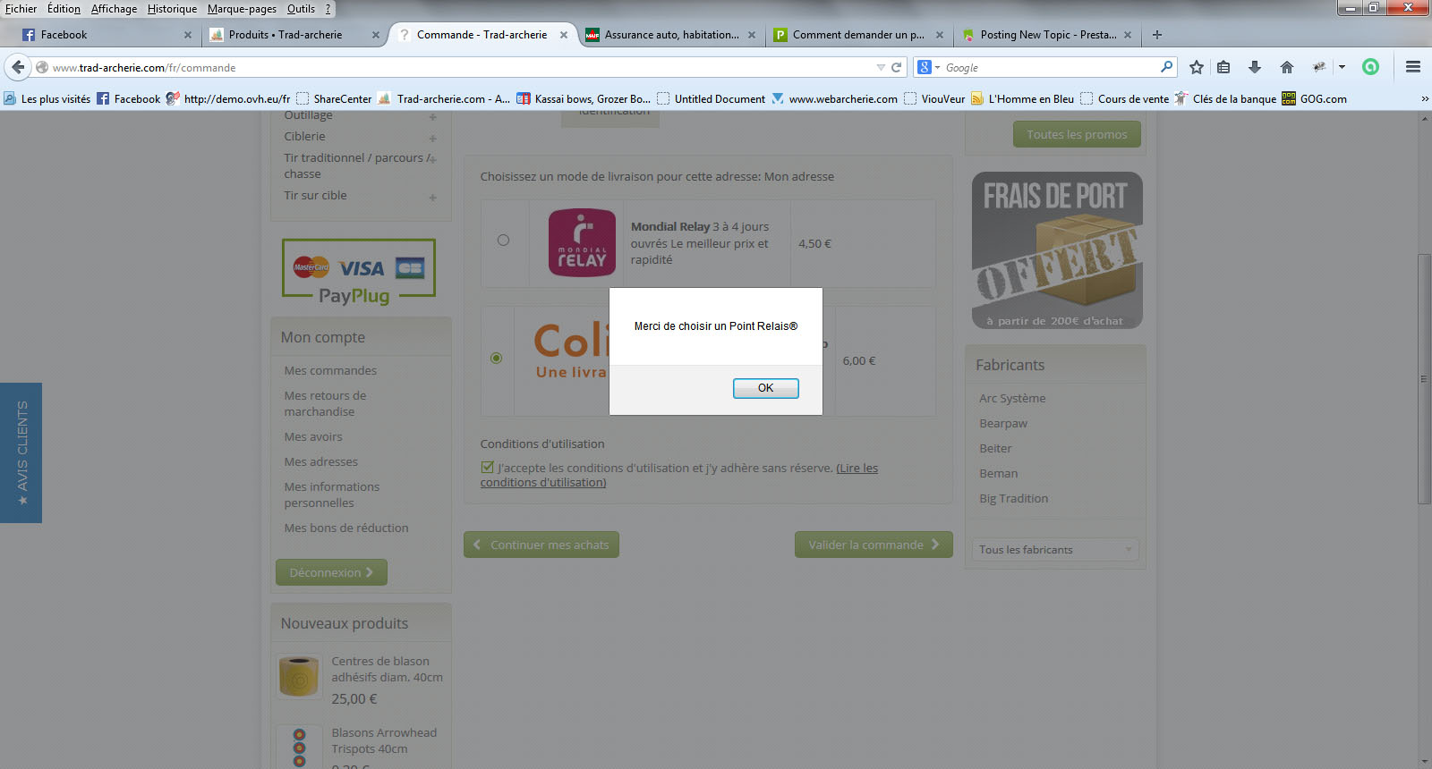 Autre problème: pour ma commande, j'ai le choix entre Mondial Relay et Colissimo, et je me retrouve obligé de choisir Mondial Relay: si je sélectionne Colissimo, j'ai le message "veuillez choisir le point relais".