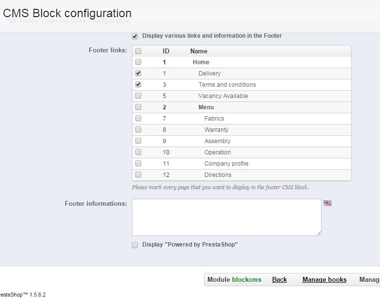 Paulito Posted January 15, 2015 Share Posted January 15, 2015 Hello Back office > Modules > Modules > Front office Features > CMS block > Configure >.Footer Information http://screencast.com/t/ryNQHvyG Paul Link to comment Share on other sites More sharing options...