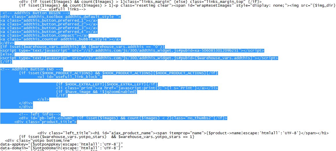 Escorpio Posted January 15, 2015 Share Posted January 15, 2015 Buenas noches, quisiera ELIMINAR la Aplicación Addthis Que Me Aparece En Cada Producto y no se como Hacerlo. De Como módulo en solitario me Aparece Bloquear sociales Mod Que se Muestra en el pie de página (y ESE si que Lo Quiero Dejar), he aquí Por Creo Que Posible Será solo Tocando el código fuente ya Que Viene Instalado Por Defecto en la plantilla. Se me ocurre ELIMINAR el Apartado Que adjunto en Captura contenido es: httpdocs / themes / almacén / product.tpl ¿Con eso seria Suficiente? y Si No Es La Solución ¿como eliminarlo? ¡Ah! Se Trata de Prestashop v. 1.5.6.2 y el tema es Almacén de IQIT-COMMERCE.COM Link to comment Share on other sites More sharing options...