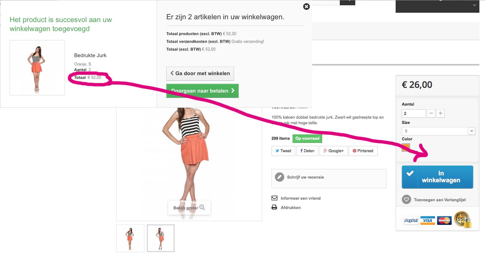axsen25 Posted January 16, 2015 Share Posted January 16, 2015 (edited) Hallo, Ik wil een webshop starten in relatiegeschenken waarbij mensen kunnen kiezen uit verschillende aantallen. Maar de totaalprijs is pas zichtbaar zodra men 'm heeft toegevoegd aan de winkelwagen, zie bijlage. Is het mogelijk om boven de knop "in winkelwagen" de totaal prijs te zetten? mvg Alex Edited January 26, 2015 by axsen25 (see edit history) Link to comment Share on other sites More sharing options...