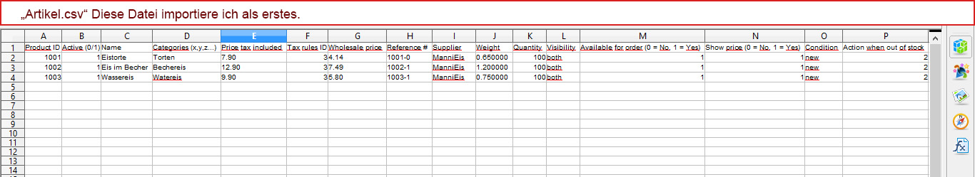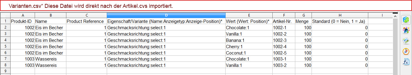 RXBeat Posted January 17, 2015 Share Posted January 17, 2015 Ich hab folgendes Problem und versuche es gut zu erklären. Also füge meine Artikel per CSV ein und die Varienten ebenfalls. Ich habe dafür 2 Dateien erstellt. Ein mal Artikel.csv und ein mal Varianten.csvIch benutze OpenOffice Calc. Hier ein Beispiel:In der Artikel.csv hab ich folgendes: Product ID=1001 Aktiv=1Name=Eis Preis=1,50 Gewicht=0.02Kg Artikel-Nr.=1001-1 Funktioniert alles Super. Von Produkt ID=1001 möchte ich aber 2 verschiedene Varianten haben. Sagen wir Schoko und Vanille.Habe also die Varianten.csv mit folgender einstellung:Product ID=1001 Eigenschaft/Variante (Name:Anzeigetyp:Anzeige-Position)*=Geschmacksrichtung:select:1 Wert (Wert: Position)*=Schoko:1 Artikel-Nr.=1001-1 Nächste Zeile:Product ID=1001 Eigenschaft/Variante (Name:Anzeigetyp:Anzeige-Position)*=Geschmacksrichtung:select:1 Wert (Wert: Position)*=Vanille:1 Artikel-Nr.=1001-2 Es wird mir auch Schoko und Vanille zur auswahl angezeigt ABER... Wenn ich auf das Produkt klicke, zeigt der mir die ersten paar sekunden das Gewicht an dann lädt der plötzlich Schoko als Standard und da ist das Gewicht nicht drinne.Das im Artikel.csv ist ja jetzt kein eigenes Produkt mehr. Eis ohne geschmack gibt es ja nicht. Hab ich einen denkfehler? Jedenfalls übernimmt "Schoko" und "Vanille" nicht das Gewicht vom Artikel selbst.Und kann mir einer genauer (Name:Anzeige-Position) und (Wert:Position) erklären?Ob ich da 0, 1 oder 2 drinne stehen hab, da ändert sich nichts. Konnte ich es erklären? Link to comment Share on other sites More sharing options...