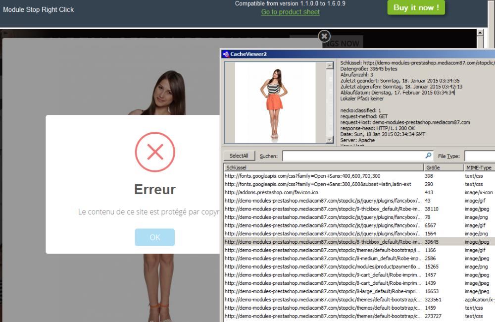 Whiley Posted January 18, 2015 Share Posted January 18, 2015 Ich würde nicht allzuviel Arbeit in diese Geschichte stecken. Jedes Bild lässt sich kinderleicht und problemlos aus dem Cache heraus speichern egal welche Sicherung das Bild schützen soll. Hier mal am Beispiel des Demoshops( Prestashp addon Stop Right Click) gezeigt. Im Firefox das addon "CacheViewer 2" installiert, auf "Dateien im Cache" klicken, Bild auswählen, speichern und fertig. Ich würde eher darüber nachdenken Wasserzeichen in den Bildern zu integrieren und dann gegebenenfalls strafrechtlich gegen ev, Missbrauch vorgehen. Grüsse Whiley 1 Link to comment Share on other sites More sharing options...