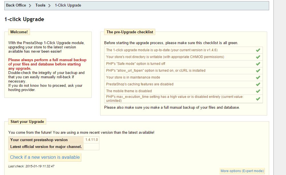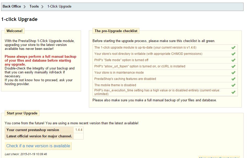 bedum777 Posted January 19, 2015 Share Posted January 19, 2015 (edited) HI expect, I am using v1.4.4 and i am not able to upgrade my prestashop v1.4.4 to the latest v1.6 using the 1-click module. The message i got is as below. "You come from the future! You are using a more recent version than the latest available!" The button i see is "check if the new version is available". I tried clicking on that button but the new version is never showing. I checked the setting.inc.php and noticed there there stores the define('_PS_VERSION_', '1.4.4');. I am not sure if that version number had been overwritten. I had tried changin the version number to others but i never get the "UPGRADE PRESTASHOP NOW" button showing. Any advice? Thanks. Edited January 19, 2015 by bedum777 (see edit history) Link to comment Share on other sites More sharing options...
