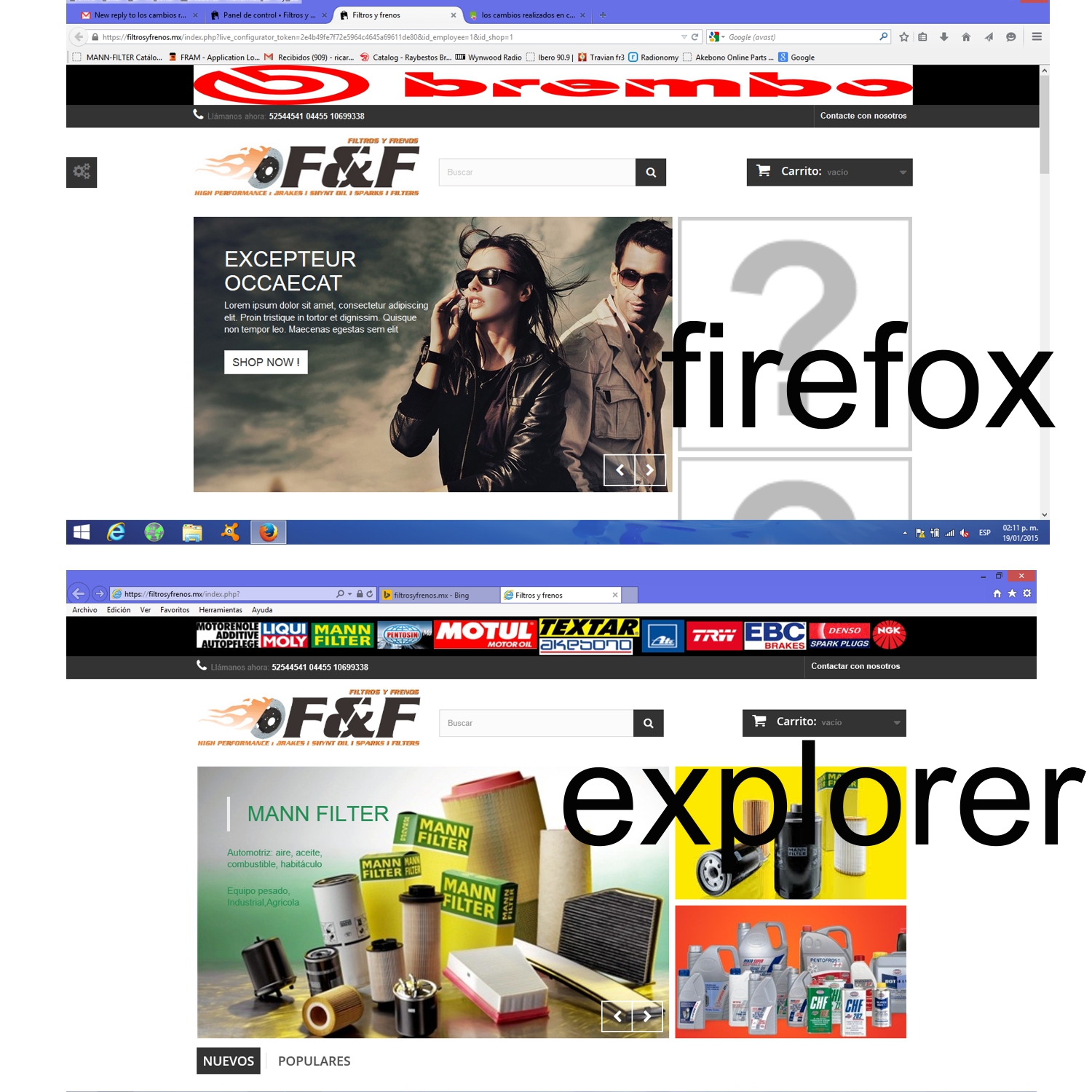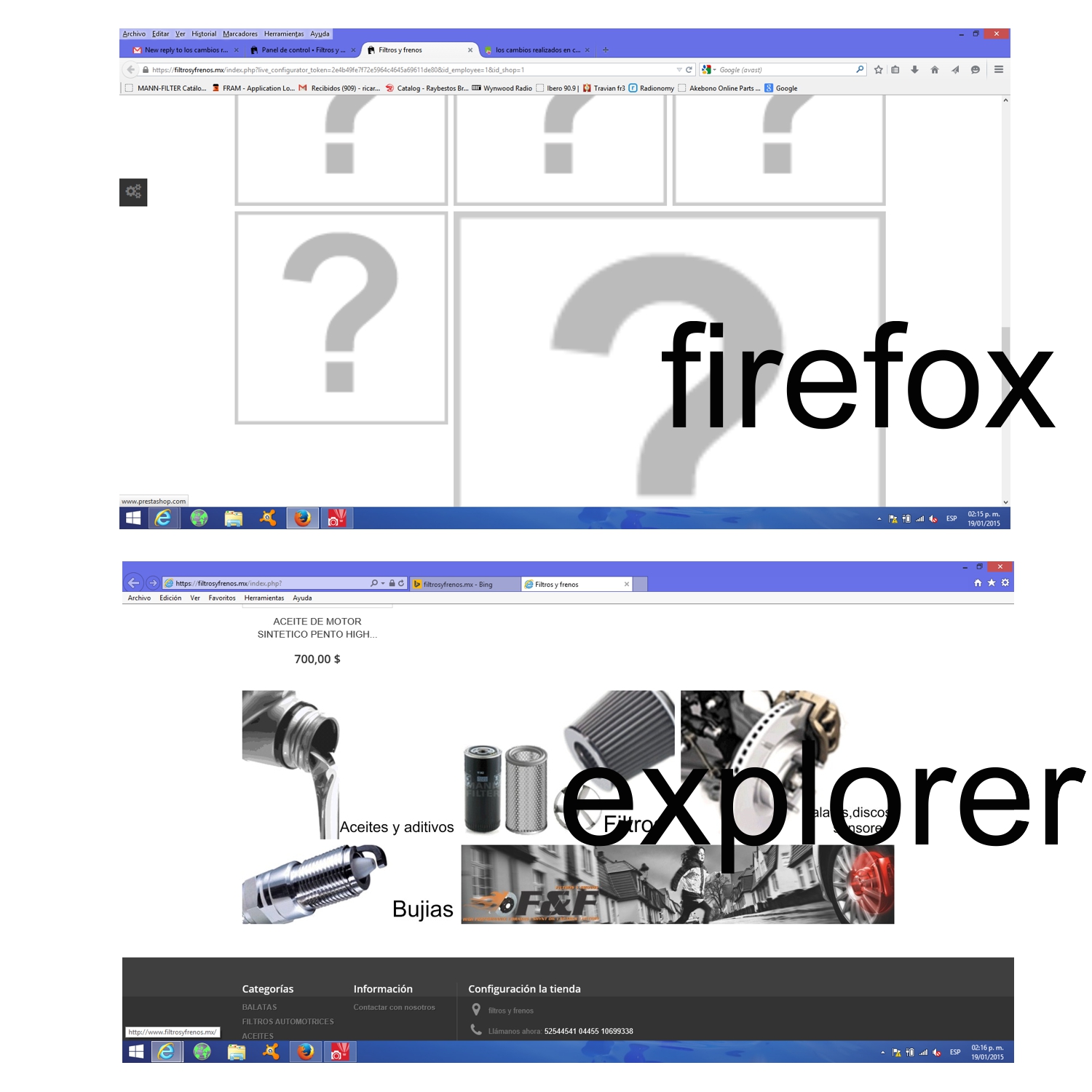 ric vicious Posted January 19, 2015 Share Posted January 19, 2015 Hola que tal, estoy construyendo la tienda online de mi proyecto, sin ebargo, los cambios que realizo en c panel del frnt office, no aarecen en mozilla firefox, en internet explorer, en dplphin browser si aparecen, no se a que se deba, si alguien me pudiese ayudar lo agradecería profundamente. aca el url: https://filtrosyfrenos.mx Saludos y gracias. Link to comment Share on other sites More sharing options...