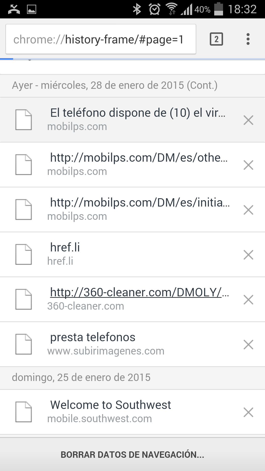 macr Posted January 29, 2015 Share Posted January 29, 2015 Ya se me ha pasado el mosqueo..... Adjunto capturas del móvil del desastre de ayer. La verdad es que solo fue el susto ya que no se instaló ninguna basura, de todas formas, molesto es y de muy malas artes proceder así esa gente de "subirimagenes.es". El primer adjunto es una de las páginas que salieron, todas de golpe haciendo que yo flipe mirando el móvil. La otra imagen que adjunto, es parte del historial, donde todas las entradas del miércoles 23 son de ese incidente. Por cierto, ¿solucionaste el problema de los teléfonos? Yo creo que se les ha pasado y o bien toca esperar o modificar archivos, ¿no? Link to comment Share on other sites More sharing options...