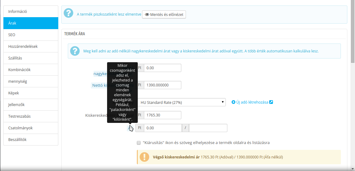 peter_borsa Posted January 20, 2015 Share Posted January 20, 2015 Ha jól értem a kérdést, akkor az 1.6.0.9-es PrestaShopban, ha új terméket viszel fel, akkor van egy "Árak" fül. Lásd a csatolt képet, szerintem azt pont az ilyen esetekre találták ki. 2 Link to comment Share on other sites More sharing options...