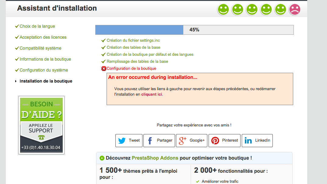 thibaud333 Posted January 20, 2015 Share Posted January 20, 2015 Bonjour, Lors de l'installation de Prestashop 1.6.0.9 sur un OVH mutualisé, j'ai ce message d'erreur Configuration de la boutique An error occurred during installation... Je n'arrive pas à en trouver la cause... Un grand merci d'avance ! Link to comment Share on other sites More sharing options...