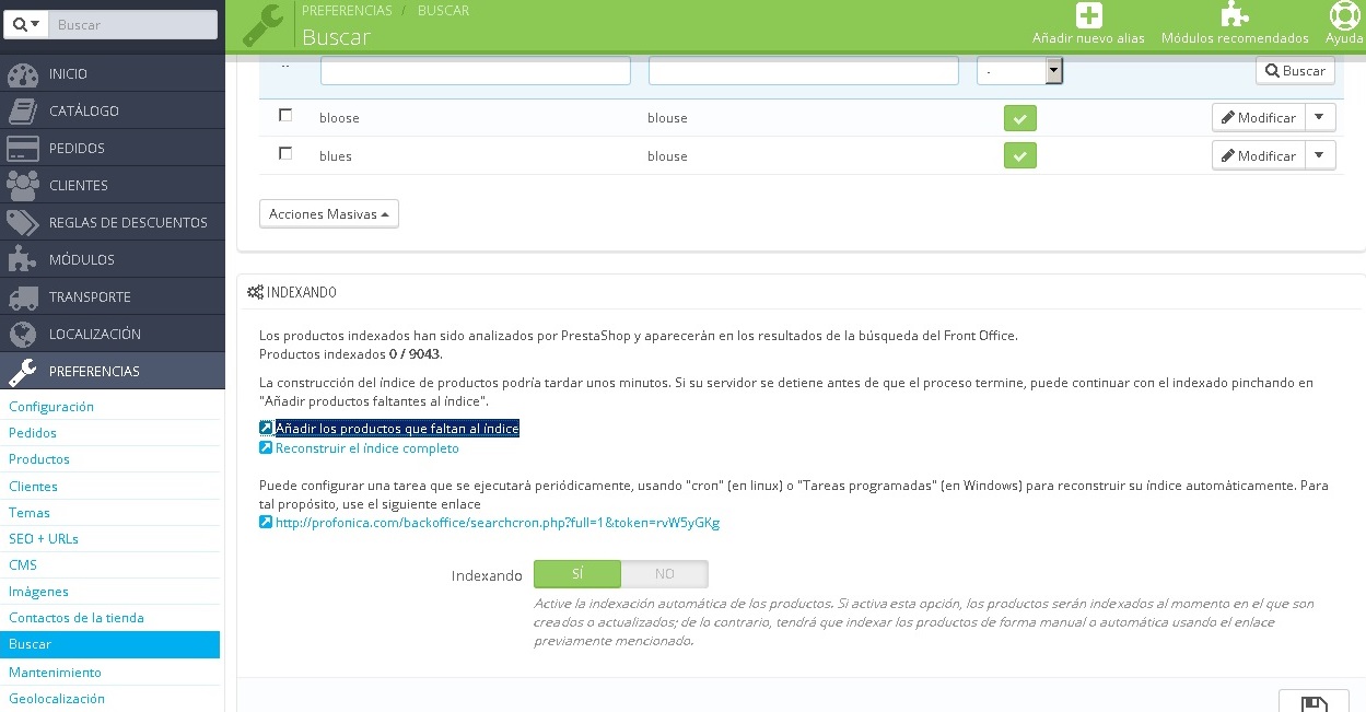 El tema es que tengo casi 10.000 imágenes que no puedo indexar,  en preferencias / buscar, y en la parte de indexando, le doy a "Añadir los productos que faltan al índice" y unos segundos mas tarde,