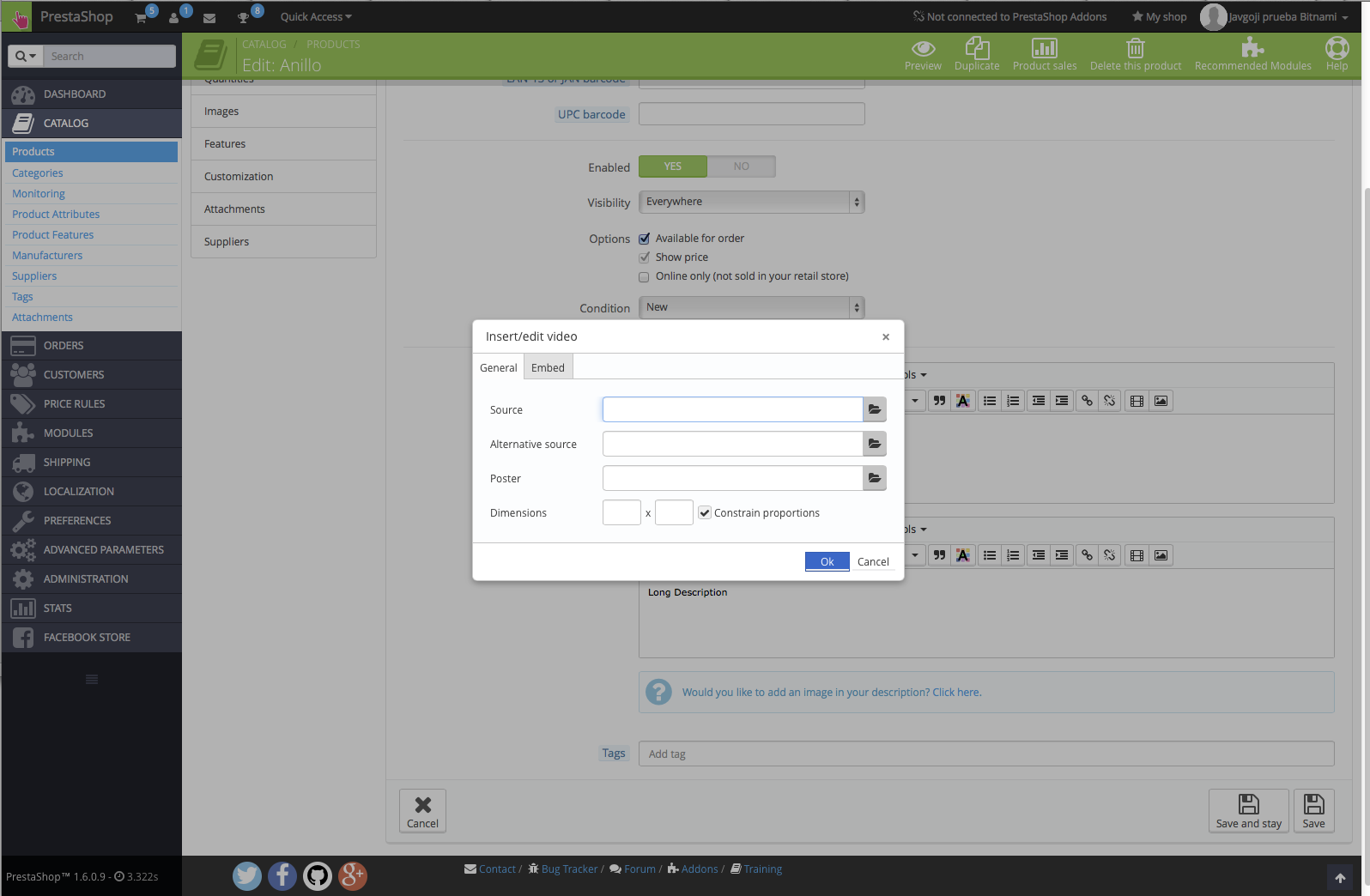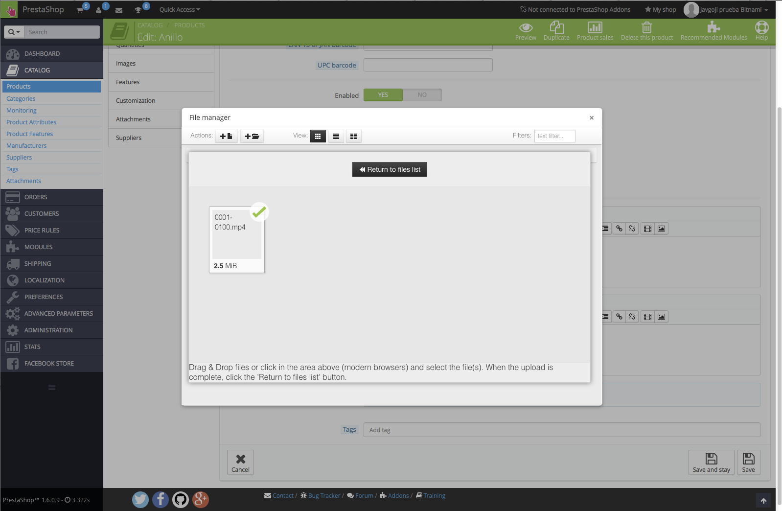 I can´t add product videos to my local server. Prestashop 1.6.9-OSX 10.9