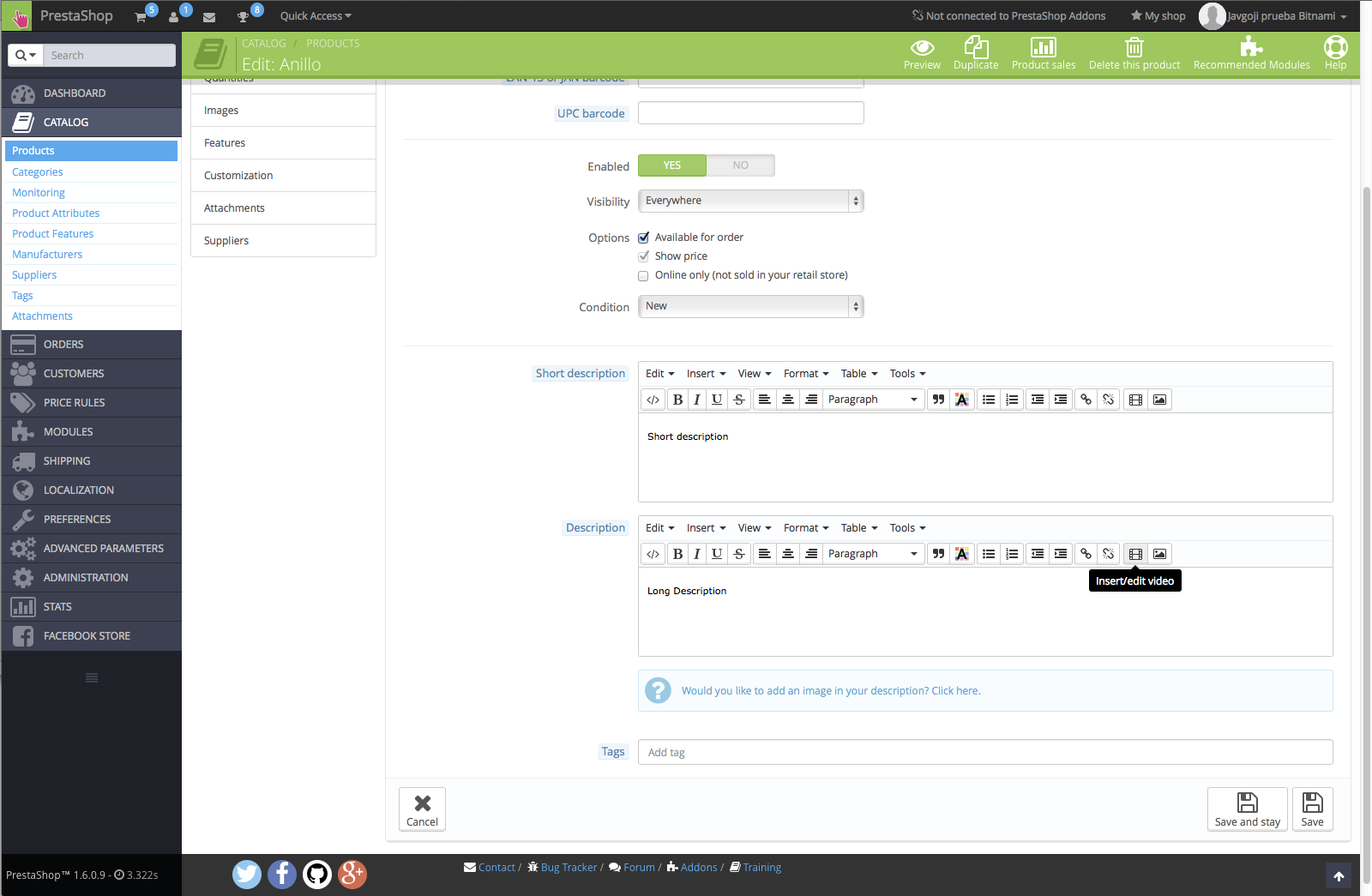 I have tried to add a video as a long description in product.