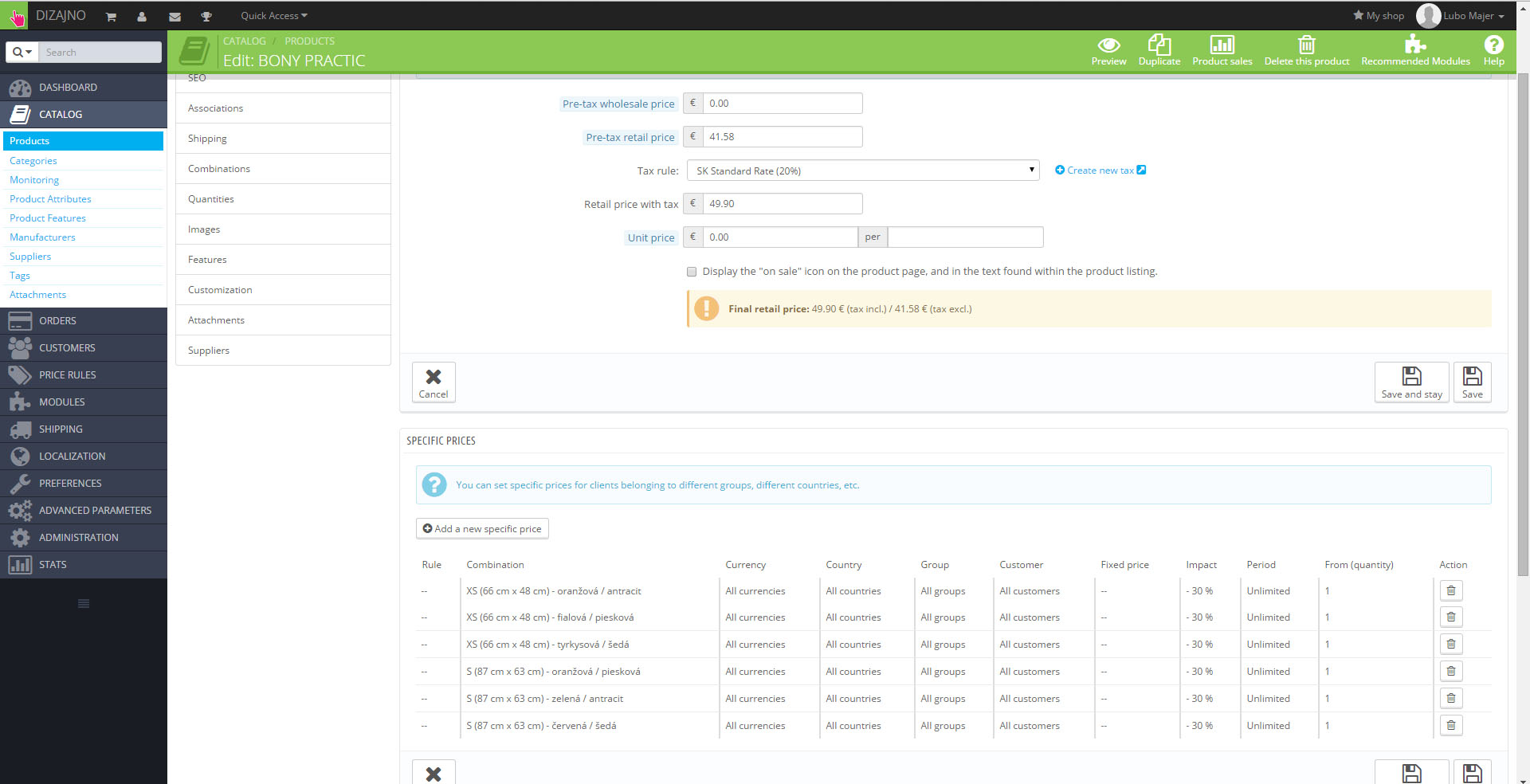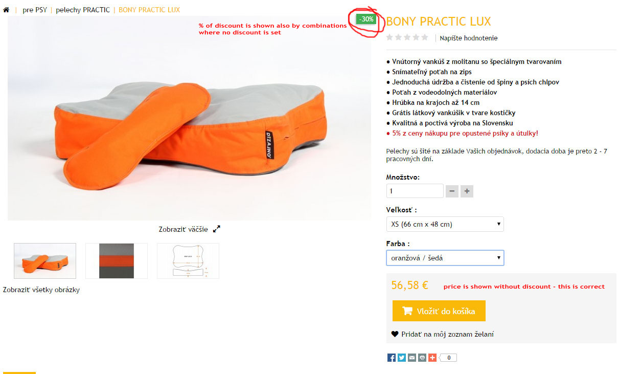 lubomajer Posted January 25, 2015 Share Posted January 25, 2015 Hello, I have found problem when trying set the discounted prices for only one combination of product (specific colour and size) in Prestashop 1.6.0.6. I set the specific price with % discount for one combnation in the product settings. The settings are exactly the same for all product and discount. I have found following problems /bugs: - By one product it shows old price and % of discount above the product picture, but in all pictures, also for the combinations where is no discount set - by other product it shows old price, also when there is no discount for this combination, old price is same as the sale price - by third product it shows only discounted prices without old price and without % discount above picture All products are in same category. I do not use warehous, is switched off. I use template UniqueShop, but I tried to switch to the default template, and the problem remains. Please do you have experiences how to correct these problems? Thank you very much! Link to comment Share on other sites More sharing options...