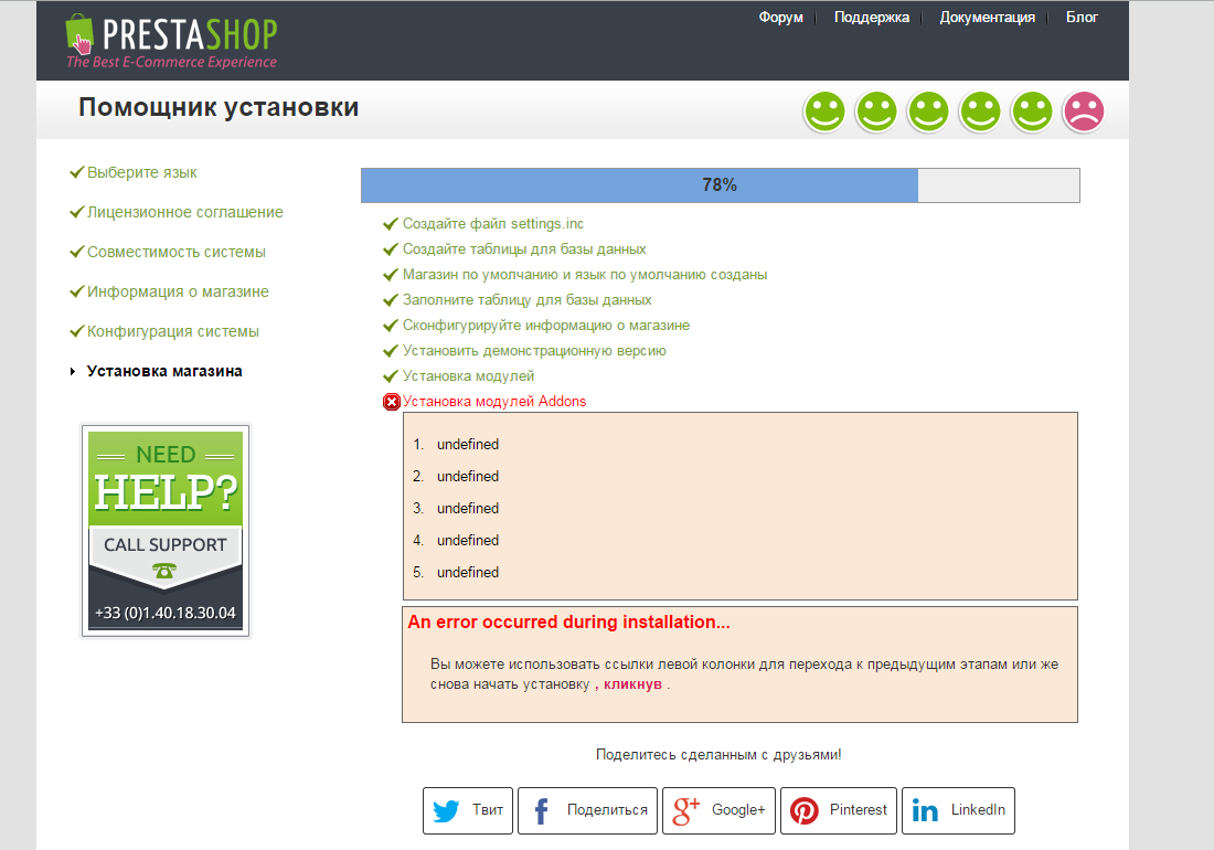 nick_E Posted January 30, 2015 Share Posted January 30, 2015 (edited) В общем установил Open Server 5.2.2 попытался установить, выдает ошибку на шаге установки модулей. В чем может быть дело? в лог файле следующее: *ERROR* 2015/01/30 - 09:43:36: Невозможно установить модуль "gamification" *ERROR* 2015/01/30 - 09:43:36: Невозможно установить модуль "blockwishlist" *ERROR* 2015/01/30 - 09:43:36: Невозможно установить модуль "productcomments" *ERROR* 2015/01/30 - 09:43:36: Невозможно установить модуль "sendtoafriend" *ERROR* 2015/01/30 - 09:43:36: Невозможно установить модуль "cronjobs" Edited January 30, 2015 by nick_E (see edit history) Link to comment Share on other sites More sharing options...