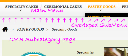 artway Posted January 30, 2015 Share Posted January 30, 2015 Hi,My problem:I created a new CMS Category (PASTRY) with 2 CMS Subcategory pages (SPECIAL, DIETARY).Everything works fine with one exception.When a CMS Subcategory page is open it overlaps (hides) all MainMenu drop down list including the PASTRY drop down list (SPECIAL, DIETARY). See attachment.My Subcategory pages include image Java Script hovers. Does it cause a problem?Thank you. Link to comment Share on other sites More sharing options...
