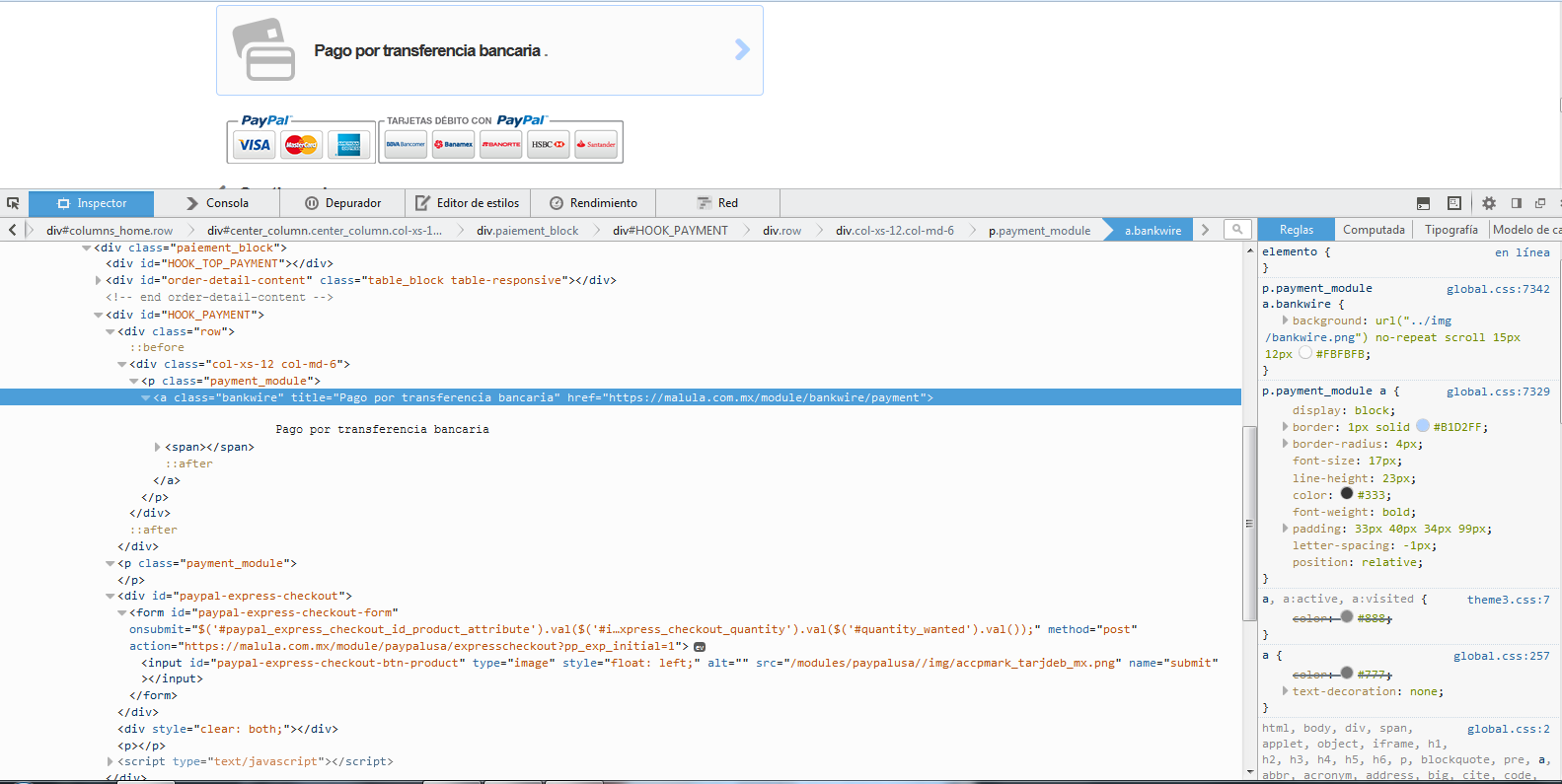 Salim.gassab Posted February 2, 2015 Author Share Posted February 2, 2015 Hola Orlangrod, Gracias por la respuesta, soy nuevo en prestashop, me gustaría si puedes explicarlo con mas detalles. No sé que debo poner y donde para que sean del mismo estilo. si fuera archivo HTML sé hacerlo pero en prestashop parece que no lo tiene. le adjunto una captura y el estilo del boton bankwire: p.payment_module { margin-bottom: 10px; } p.payment_module a { display: block; border: 1px solid #B1D2FF; -webkit-border-radius: 4px; -moz-border-radius: 4px; border-radius: 4px; font-size: 17px; line-height: 23px; color: #333333; font-weight: bold; padding: 33px 40px 34px 99px; letter-spacing: -1px; position: relative; } p.payment_module a.bankwire { background: url(../img/bankwire.png) 15px 12px no-repeat #fbfbfb; } p.payment_module a.cheque { background: url(../img/cheque.png) 15px 15px no-repeat #fbfbfb; } p.payment_module a.cash { background: url(../img/cash.png) 15px 15px no-repeat #fbfbfb; } p.payment_module a.cheque:after, p.payment_module a.bankwire:after, p.payment_module a.cash:after { display: block; content: "\f054"; position: absolute; right: 15px; margin-top: -11px; top: 50%; font-family: "FontAwesome"; font-size: 25px; height: 22px; width: 14px; color: #B1D2FF; } p.payment_module a:hover { background-color: #f6f6f6; } p.payment_module a span { font-weight: bold; color: #777777; }.payment_module.box { margin-top: 20px; } Un saludo Link to comment Share on other sites More sharing options...